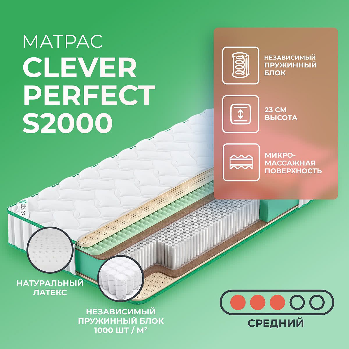 Матрас Clever Perfect S2000 из коллекции Soul — современное решение для тех, кто ценит сбалансированный комфорт, надежную поддержку и премиальные материалы. Матрас создан с учетом высоких стандартов качества и обеспечивает комфорт высокого уровня благодаря сочетанию независимого пружинного блока и натурального латекса. Высота 23 см делает его универсальным для большинства кроватей, а средняя жесткость обеих сторон подходит для широкого круга предпочтений. Благодаря слоистой структуре и использованию латекса, кокоса и конволюторного ППУ, матрас поддерживает тело в естественном положении, обеспечивая мягкость и упругость. Независимый пружинный блок S2000 с плотностью 1000 пружин на м2 рассчитан на нагрузку до 130 кг на спальное место, что гарантирует долговечность и точечную поддержку. Ключевые особенности