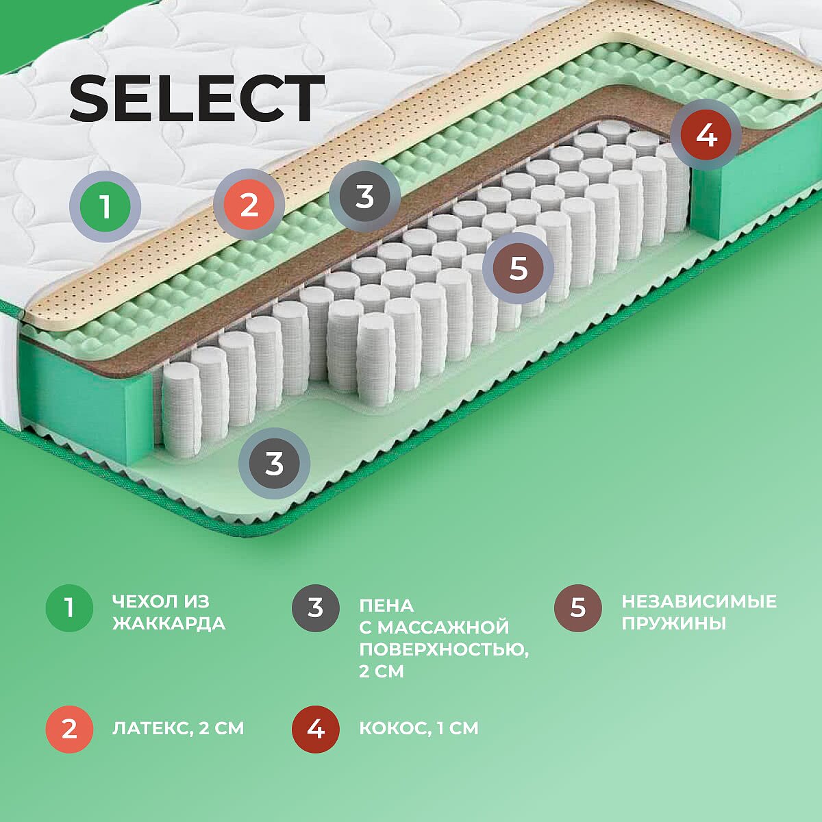 Нагрузка на спальное место, кг: 110. Высота, см: 23. Матрас скручен в рулон. Матрас Select не зря имеет слово “выбор” в своем названии. Дело в том, что степень жесткости сторон разная — умеренно-мягкая и средне жесткая. Базируется модель на блоке независимых пружин TFK. Уникальность независимых пружин в том, что ход каждой пружины не связан с сжатием соседней, поэтому матрас воспринимает нагрузку равномерно и точечно. Обе стороны изделия имеют микромассажный эффект. С одной стороны он ярко выражен — достигнут с помощью конволюторного пенополиуретана с ребристым рисунком. Массажная поверхность способствует снятию напряжения с мышц и конечностей. Другая сторона матраса имеет порядок слоев: кокосовые волокна, массажный слой и натуральный латекс. Кокос дает ровную и твердую поверхность, а следом идущие материалы его смягчают. Латекс эластичен и упруг — он способен правильно повторять формы спящего человека.