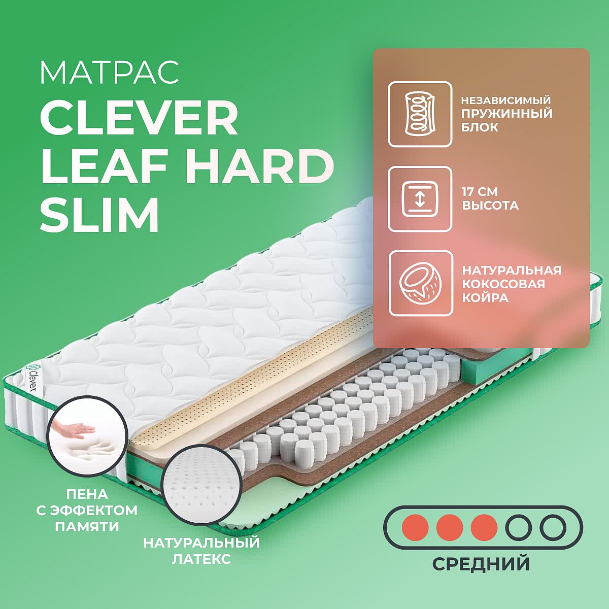 Матрас «Clever Leaf Hard Slim» — средней жесткости, которая комфортна большинству людей среднего телосложения. Это — универсальный вариант и детям, и взрослым, и пожилым людям.
