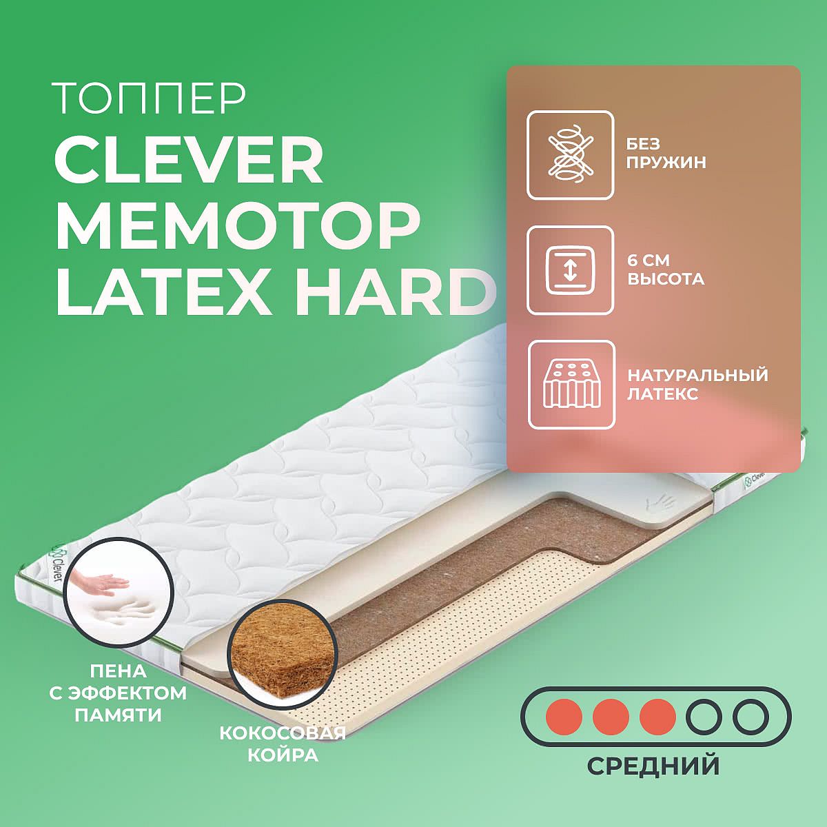 Матрас «Clever MemoTop Latex Hard» — средней жесткости, которая комфортна большинству людей среднего телосложения. Это — оптимальный выбор и детям, и взрослым, и пожилым людям.