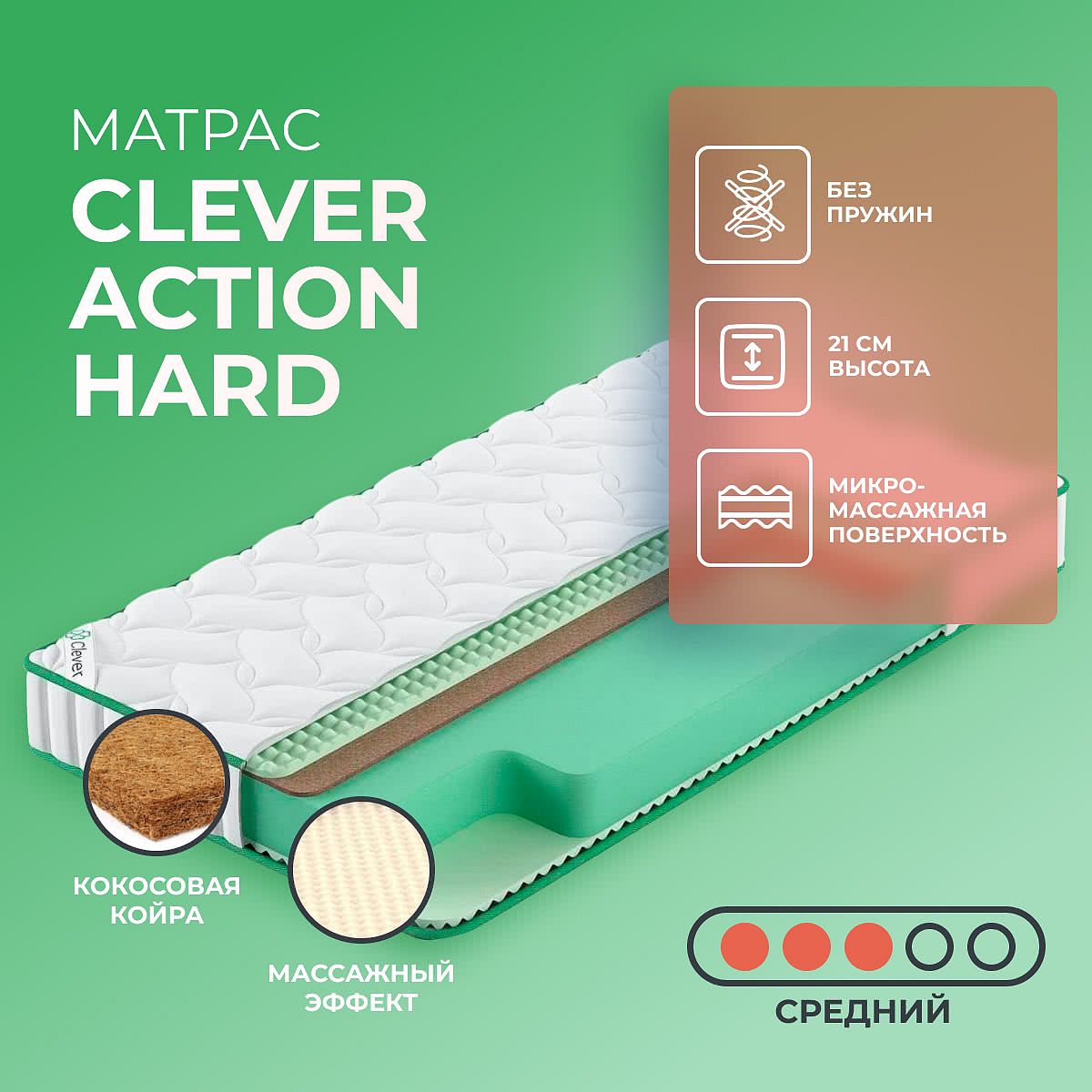 Матрас «Clever Action Hard» — средней жесткости, которая подходит большинству людей среднего телосложения. Это — оптимальный вариант и детям, и взрослым, и пожилым людям.