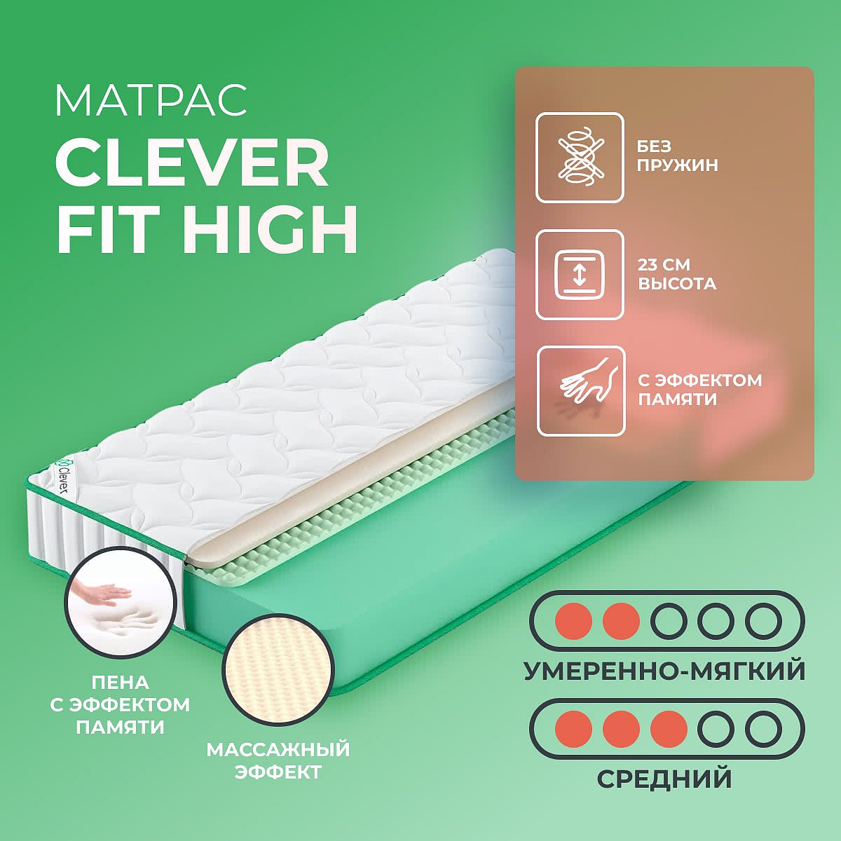 Матрас Clever Fit High — это беспружинная модель из коллекции Twist, созданная для комфортного сна и поддержания правильного положения тела. Благодаря двум разным сторонам с умеренно мягкой и средней жёсткостью, матрас легко адаптируется под ваши предпочтения. Высота 23 см обеспечивает достаточный уровень поддержки и комфорта для ежедневного использования. Верхний слой из пены с эффектом памяти (мемориформ) мягко повторяет контуры тела и помогает снизить давление на основные точки, а конволюторный слой ППУ дарит лёгкий массажный эффект. Основной слой из плотного ППУ придаёт матрасу необходимую упругость и долговечность. Чехол выполнен из прочного синтетического жаккарда, простёганного на синтепоне, что делает поверхность приятной на ощупь и аккуратной на вид. Ключевые особенности