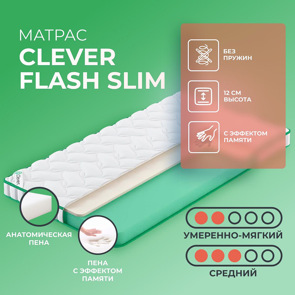 Преимущество матраса Flash Slim — он имеет 2 различные по жесткости стороны: средне-мягкую и средне-жесткую.