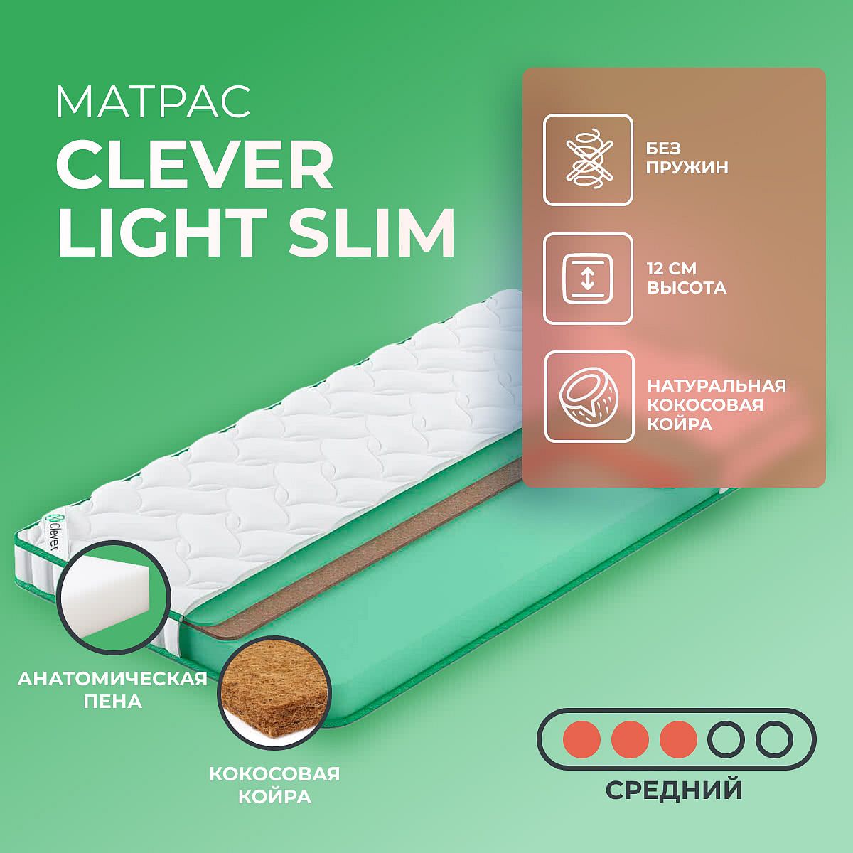 Матрас «Clever Light Slim» — средней жесткости, которая подходит большинству людей среднего телосложения. Это — универсальный вариант и детям, и взрослым, и пожилым людям.