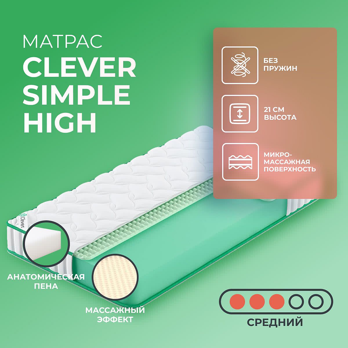 Матрас Clever Simple High — это современный беспружинный матрас средней жесткости, созданный для комфортного сна и ежедневного использования. Благодаря высоте 21 см и сочетанию двух слоёв ППУ, матрас обеспечивает приятную поддержку, а также мягкое ощущение благодаря верхнему конволюторному слою. Такой вариант отлично подойдёт для тех, кто ценит надежность, умеренную упругость и ровную поверхность для отдыха. Чехол выполнен из прочного синтетического жаккарда, простёганного на синтепоне, что придаёт матрасу аккуратный внешний вид и дополнительную мягкость. Матрас Clever Simple High поставляется в рулоне, что упрощает доставку и размещение даже в небольших помещениях. Ключевые особенности