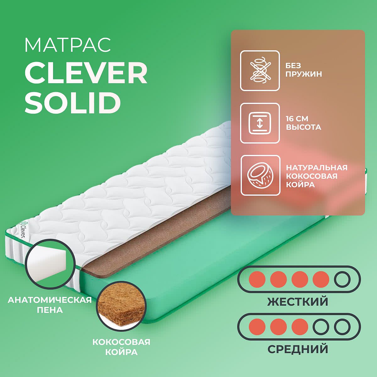 Нагрузка на спальное место, кг: 110. Высота, см: 16. Матрас Solid от бренда Clever не имеет пружинного блока. За основу взят слой пенополиуретана толщиной в 14 см. Современный вспененный материал хорошо заменяет пружинный блок, отлично пропускает потоки воздуха и не способен впитывать капли влаги. Каждая сторона этого матраса имеет разную жесткость. Со стороны пенополиуретана жесткость средняя. На другой стороне матраса проложены кокосовые волокна (2 см), что делают эту сторону максимально жесткой. Прессованные кокосовые волокна пропитаны соком натурального латекса, что делает их эластичными. Особые пропитки кокосовых волокон отталкивают воду, что делает спальное место максимально гигиеничным. Матрас хорошо подойдет тем, кто любит твердую и жесткую спальную поверхность, но если надоест, его можно перевернуть в любой момент.