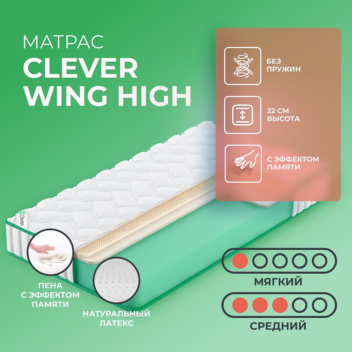Матрас Clever Wing High — это современный беспружинный матрас с двумя разными сторонами жесткости: мягкой и средней. Такая конструкция позволяет подобрать комфортный вариант для сна в зависимости от личных предпочтений. Высота изделия 22 см обеспечивает приятное ощущение поддержки и мягкости даже при ежедневном использовании. Верхний слой выполнен из латекса (2 см), который отличается эластичностью и способностью адаптироваться к форме тела. Следующий слой — мемориформ (2 см), создающий эффект «пены с памятью» для дополнительного комфорта и снятия напряжения после дня. Основной наполнитель — плотный ППУ (18 см), отвечающий за надежную поддержку и долговечность матраса. Чехол из синтетического жаккарда простеган на синтепоне, что делает поверхность матраса приятной на ощупь и аккуратной внешне. Ключевые особенности