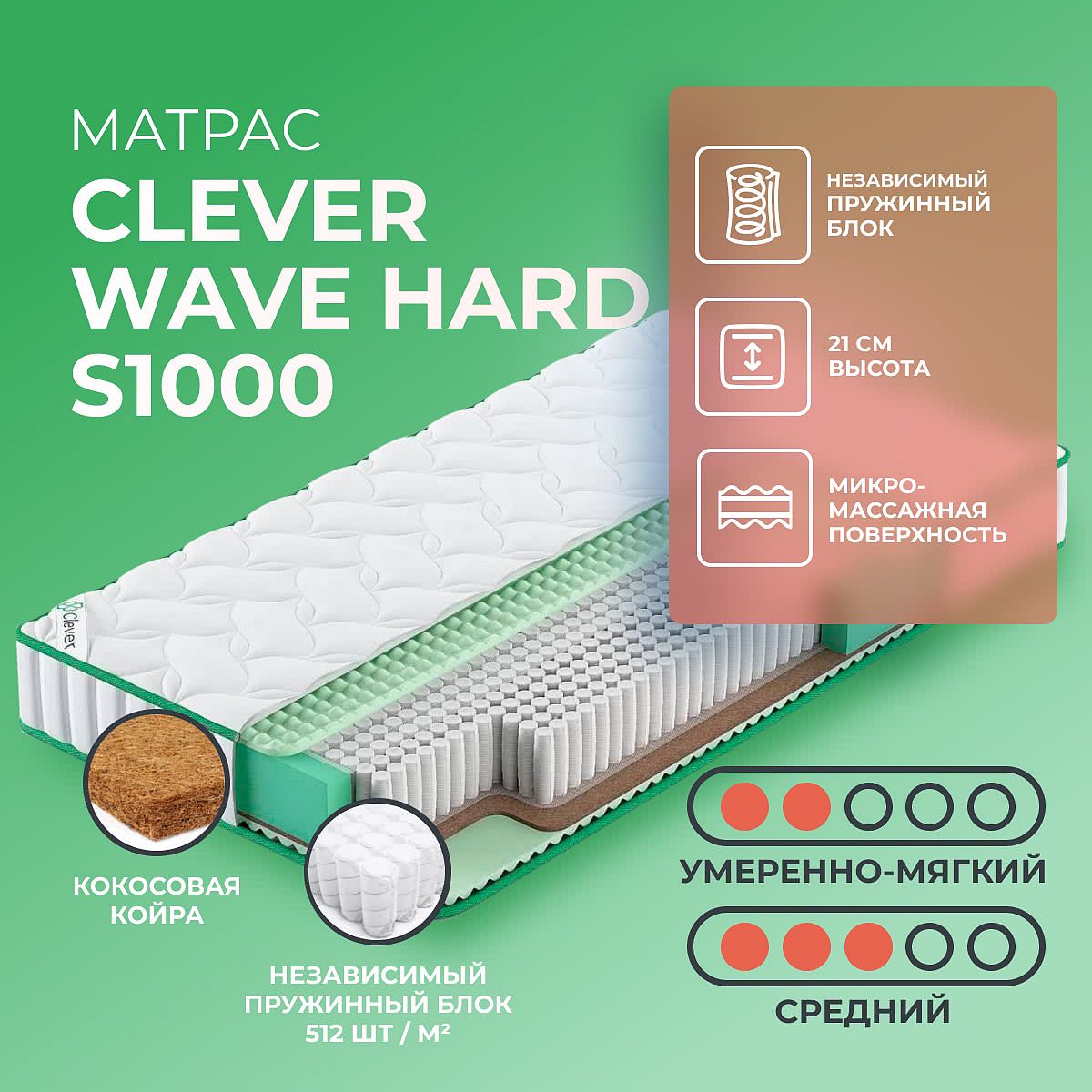 Матрас Clever Wave Hard S1000 — это современное решение для тех, кто ценит комфорт и практичность. Благодаря двум разным по жесткости сторонам, матрас подходит для смены ощущений: одна сторона умеренно мягкая, вторая — средней жесткости. Высота изделия 21 см обеспечивает оптимальную поддержку для сна и отдыха. В основе матраса — независимый пружинный блок S1000 с плотностью 512 пружин на м2, что гарантирует точечную поддержку и долговечность. Слой кокосовой койры добавляет упругости и прочности, а конволюторный ППУ создает приятную микромассажную поверхность. Чехол из синтетического жаккарда простёган на синтепоне для дополнительного комфорта. Ключевые особенности