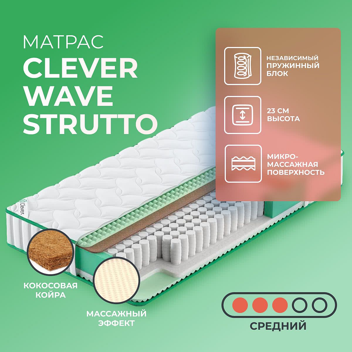 Матрас «Clever Wave Strutto» — средней жесткости, которая комфортна большинству людей среднего телосложения. Это — универсальный выбор и детям, и взрослым, и пожилым людям.