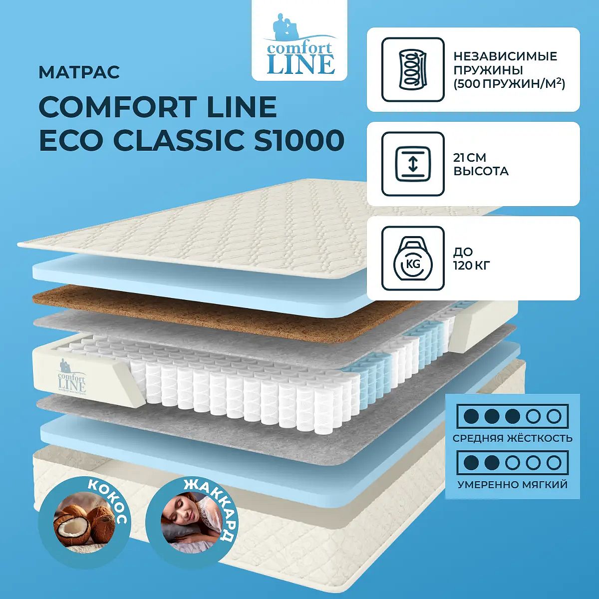 Матрас Eco Classic S1000 рассчитан на нагрузку не более 120 кг на одно спальное место.