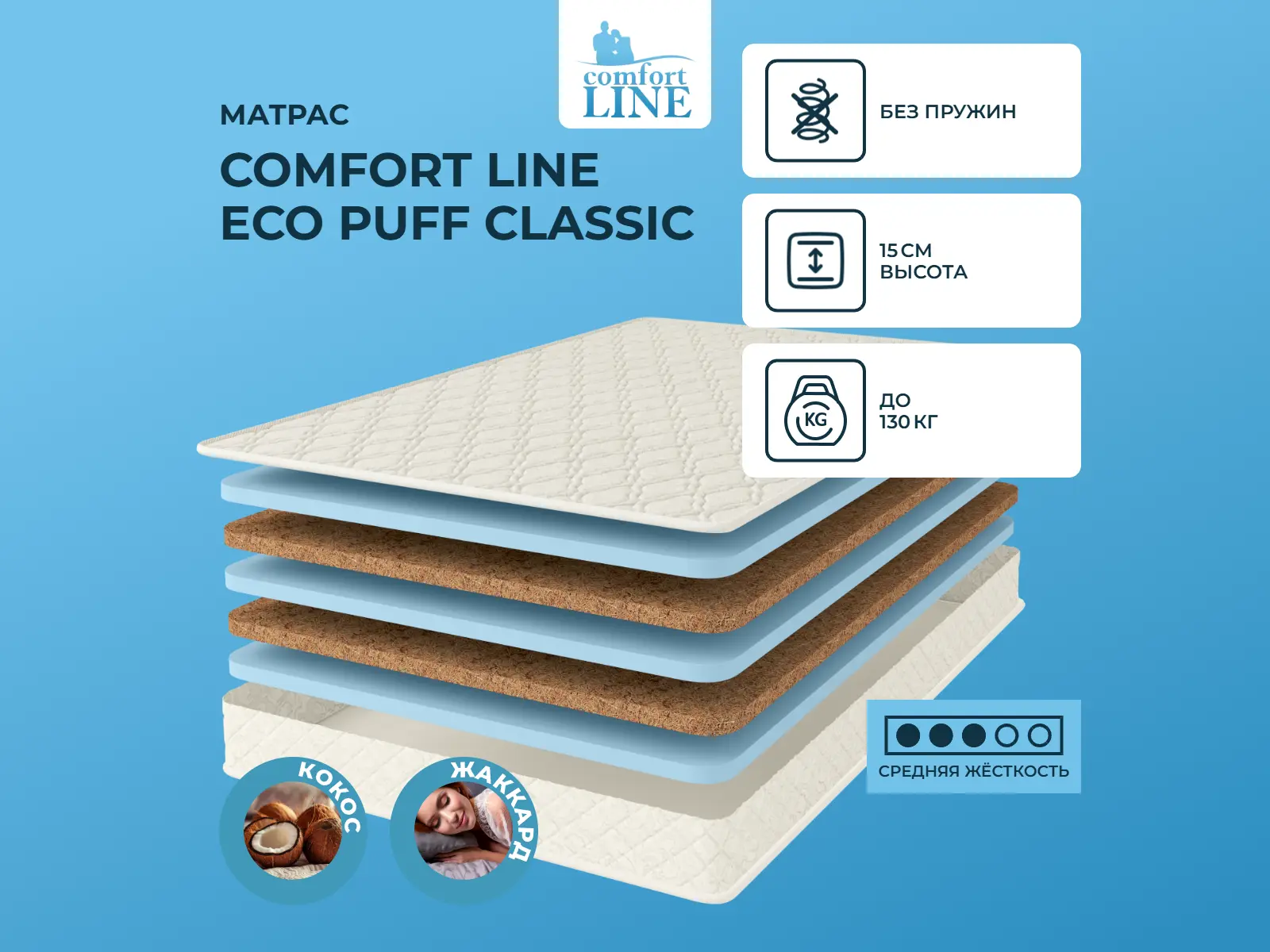 Матрас «Comfort Line Eco Puff Classic» — средней жесткости, которая подходит большинству людей среднего телосложения. Это — оптимальный выбор и детям, и взрослым, и пожилым людям.