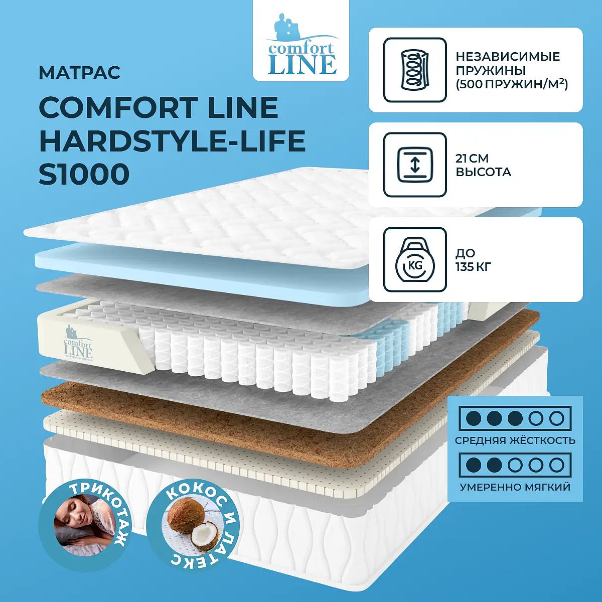 Несъемный чехол: трикотаж с антибактериальной пропиткой Aloe Vera. Стежка: холлкон (200 г). Разножесткая модель на основе пружинного блока S1000 со слоями кокоса, латекса и ППУ. Наполнение моделиМодель изготавливается на основе трех материалов: пенополиуретана, кокосовой койры и натурального латекса. Все материалы качественные и гипоаллергенные и хорошо пропускают воздух. Кокос идеально разглаживает спальную поверхность и создает надежную поддержку для позвоночника. Натуральный латекс создает мягкую поверхность с расслабляющими свойствами. ППУ - это искусственный материал с повышенными показателями по упругости и износостойкости. Также хорошо пропускает воздух и не накапливает неприятные запахи.Поддержка 1000 микропружинВ основе модели находится пружинный блок S1000, в котором сосредоточено по 500 пружин на одном квадратном метре. Все пружины помещаются в индивидуальные чехлы и точечно воспринимают нагрузку. Когда человек садится на такую поверхность, то прогибается только та часть блока, на которую идет давление.Трикотажный чехолЧехол модели выполнен из трикотажа с антиаллергенной пропиткой Aloe Vera и простеган на холлконе.Защита матрасаДля защиты поверхности матраса от загрязнений, пыли, влаги рекомендуем купить также защитный чехол или водонепроницаемый наматрасник.Другие моделиВы также можете посмотреть другие двусторонние модели серии Life: Comfort Line Medium-Life S1000, Comfort Line Hard-Style Medium Life TFK.