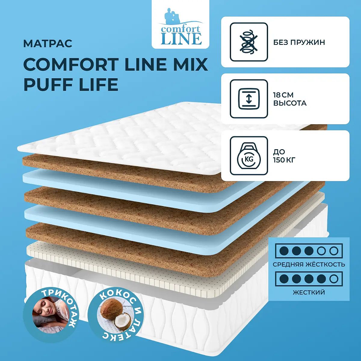 Несъемный чехол: трикотаж с антибактериальной пропиткой Aloe Vera. Стежка: холлкон (200 г). Беспружинная модель на основе слоев кокоса, латекса и ППУ. Две стороны жесткостиМодель имеет разножесткие стороны: одну с натуральным латексом, другую - на основе кокосовой койры. Между ними проложены слои кокосовой койры и пенополиуретана. Все материалы проходят проверку на качество, абсолютно гипоаллергенные и не имеют запаха.Наполнение моделиКокос поддерживает все слои в матрасе, создает надежную поддержку для позвоночника. Он хорошо вентилируется и не впитывает влагу. Латекс расслабляет тело и снимает напряжение и стресс, а пенополиуретан делает упругую и мягкую поверхность, материал также вентилируется и создает благоприятный микроклимат на спальной поверхности.Трикотажный чехолЧехол модели выполнен из трикотажа с антиаллергенной пропиткой Aloe Vera и простеган на холлконе.Защита матрасаДля защиты поверхности матраса от загрязнений, пыли, влаги рекомендуем купить также защитный чехол или водонепроницаемый наматрасник.Другие моделиВы можете посмотреть другую беспружинную модель серии Life - Comfort Line Mix Puff Profy Life.
