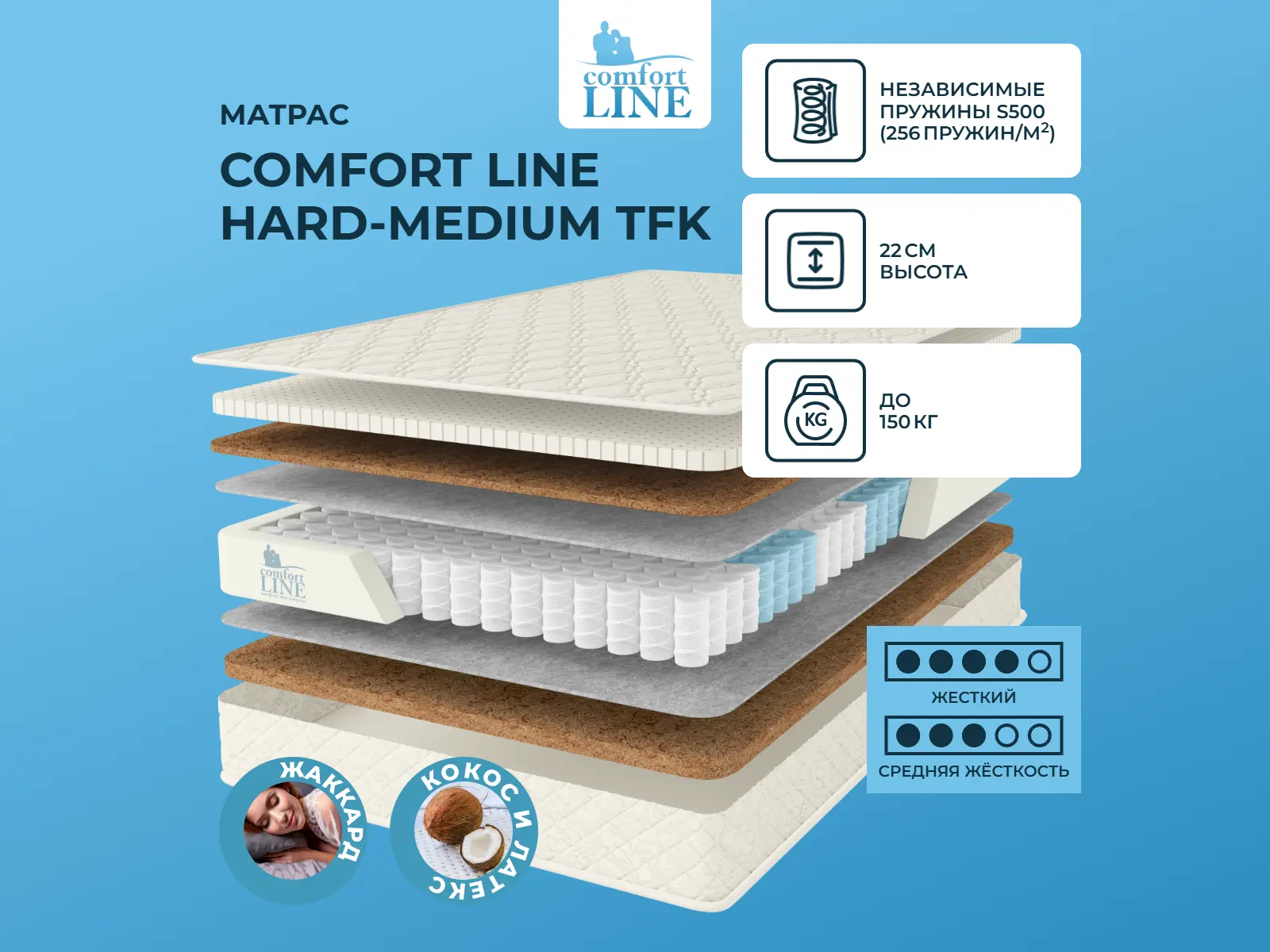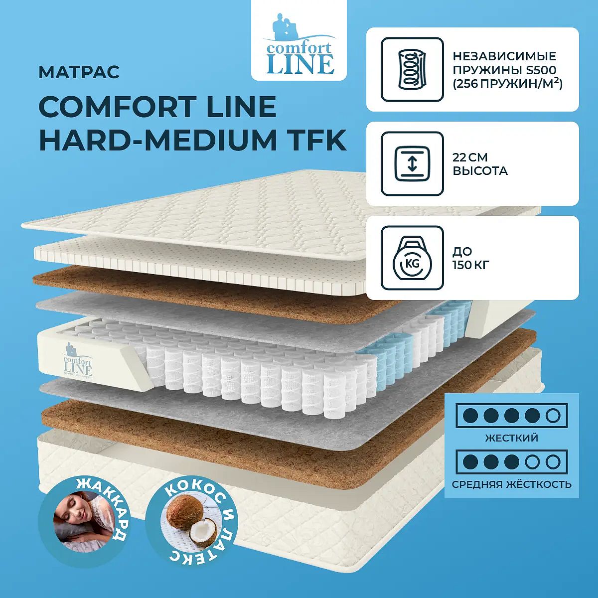 Две стороны жесткостиВ модели используются такие материалы, как натуральный латекс и кокосовая койра. С одной стороны проложен слой кокосовой койры, а с другой - кокоса и латекса. На выбор вам предоставляются две спальные поверхности.Состав матрасаНатуральный латекс и кокосовая койра – это природные наполнители. Кокос получают из ядра ореха кокосовой пальмы. Это гигиеничный материал, волокна его быстро сохнут и хорошо вентилируются. Кокос делает поверхность жесткой и удаляет все неровности. Натуральный латекс смягчает поверхность, способствует максимальному расслаблению тела, а также снятию мышечных зажимов, стресса и следов усталости, полученных в течение дня.Дейcтвие пружин TFKМодель базируется на блоке независимых пружин TFK. Это конструкция из изолированных друг от друга элементов. Каждая пружина помещена в специальный чехол и функционирует самостоятельно, когда получает нагрузку.Жаккардовый чехолЧехол модели изготовлен из плотного хлопкового жаккарда, простеганного на холлконе.Защита матрасаДля того, чтобы обеспечивать защиту вашего спального места от любых загрязнений, влаги и пыли рекомендуем купить дополнительно защитный чехол или водонепроницаемый наматрасник.Другие моделиРекомендуем также посмотреть другие модель на основе кокоса и латекса: Comfort Line Hard-Medium S1000, Comfort Line Medium-Soft TFK.