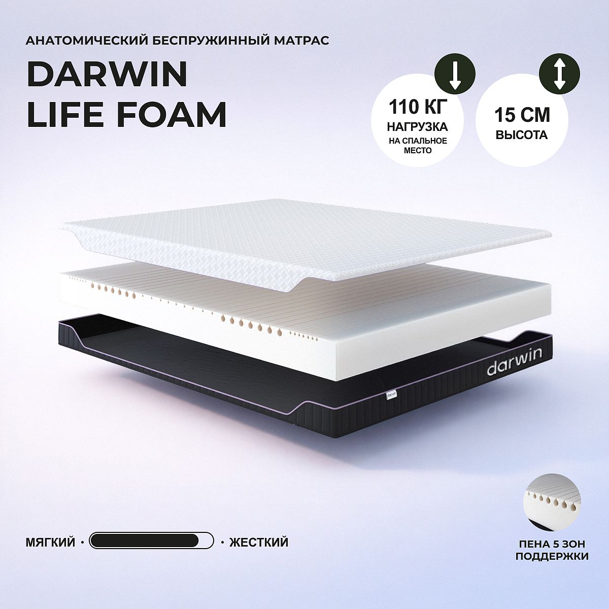 Односторонний умеренно-жесткий беспружинный матрас. Подойдет для тех, кто предпочитает качественные решения по доступной цене. В основе матраса пена высокой плотности darwin Hard TM с 5-ти зональной резкой, что позволяет снимать нагрузку с позвоночника, напряжение с мышц и суставов. Высота пены – 15 см. Съемный чехол из высокоплотного премиального трикотажа обеспечивает тактильный комфорт и выдерживает регулярные нагрузки, сохраняя исходный внешний вид. Бурлет из инновационной 3D-сетки. Нагрузка на спальное место: 110 кг. Высота: 15 см. Поставляется в скрученном виде.