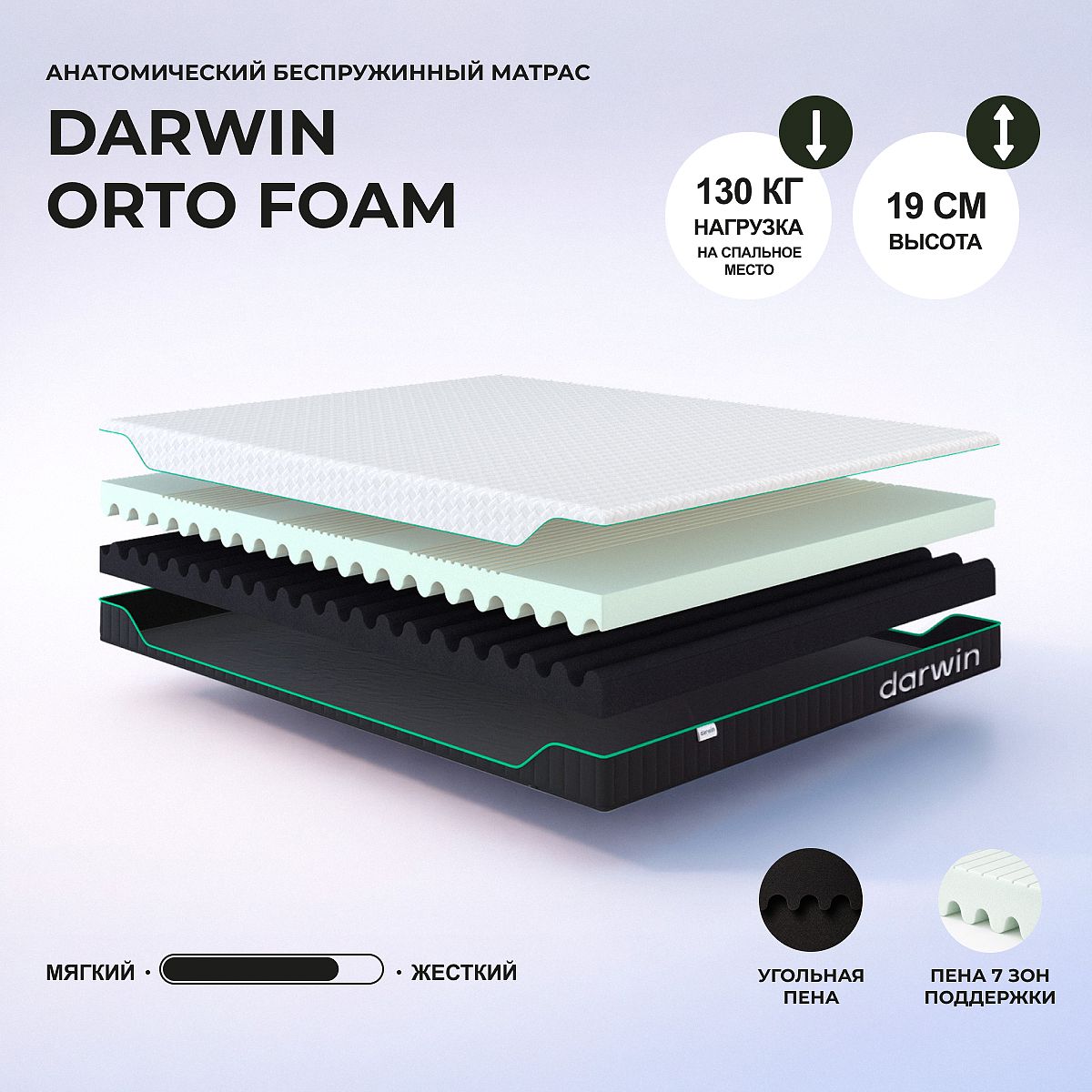 Односторонний умеренно-жесткий беспружинный матрас. Идеальный матрас для молодых и активных, для кого важен здоровый сон. А самое главное в нем — хорошее качество и доступная цена. Это комфортный матрас, который обеспечит здоровый сон на много лет вперед. Матрас состоит из двух слоев технологичной пены darwin Adaptive с 7-зонной резкой для точечного распределения нагрузки тела высотой 9 см и пеной darwin Hard Charcoal высотой 9 см. Угольная добавка препятствует размножению бактерий. Плотный матрас помогает снять мышечное напряжение и отлично подойдет всем, кто много двигается и привык к физическим нагрузкам. Съемный чехол из высокоплотного премиального трикотажа обеспечивает тактильный комфорт и выдерживает регулярные нагрузки, сохраняя исходный внешний вид. Бурлет из инновационной 3D-сетки. Нагрузка на спальное место: 130 кг. Высота: 19 см. Поставляется в скрученном виде.