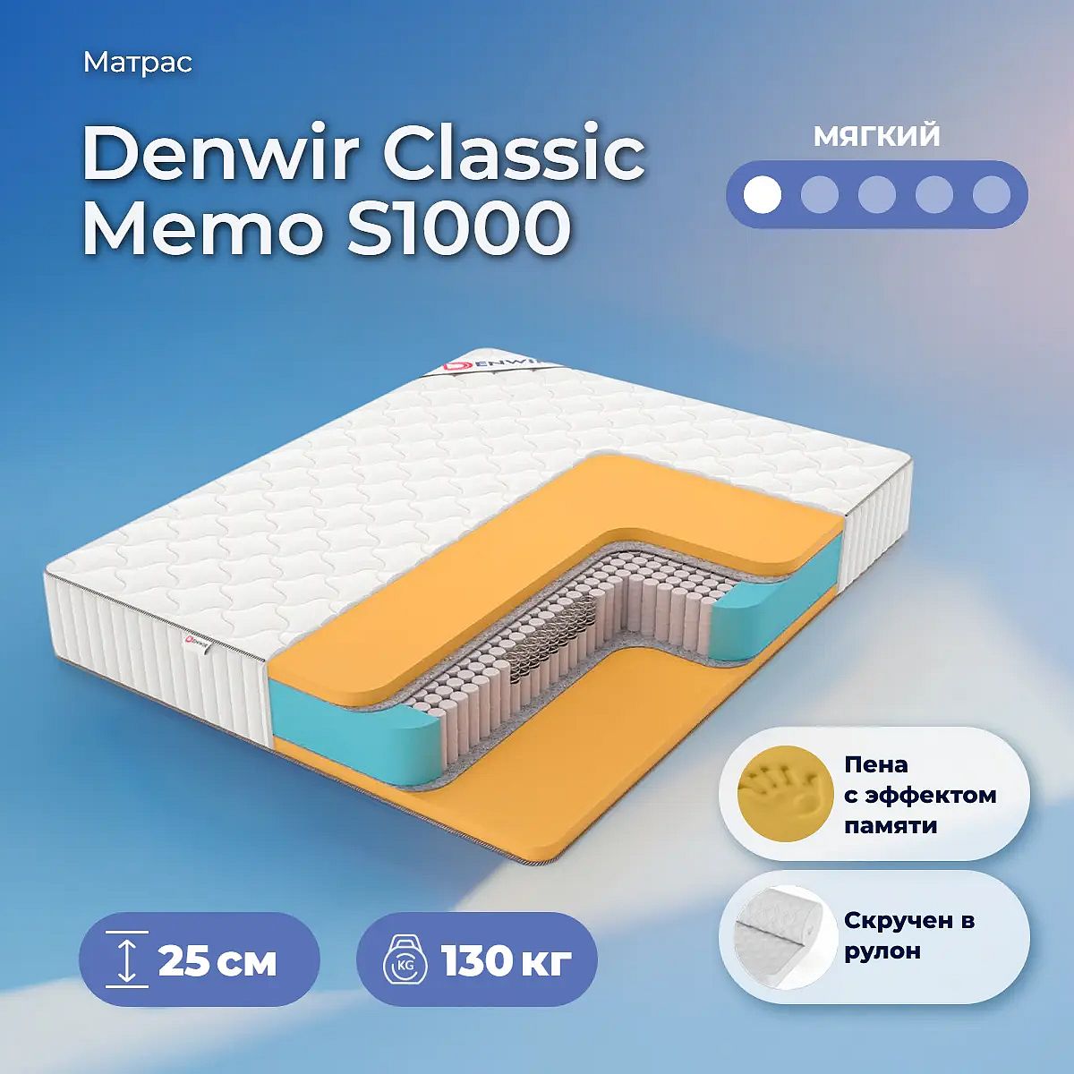Мягкий матрас «Denwir Classic Memo S1000» отлично подойдет человеку с небольшим весом, ценителю комфорта.