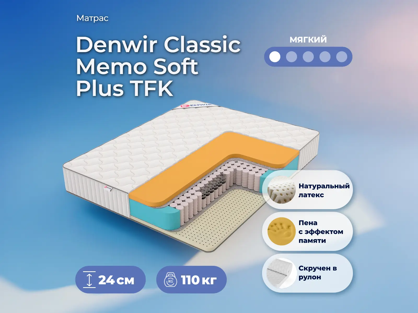 Мягкий матрас «Denwir Classic Memo Soft Plus TFK» отлично подойдет человеку с небольшим весом, предпочитающему высокий уровень комфорта.