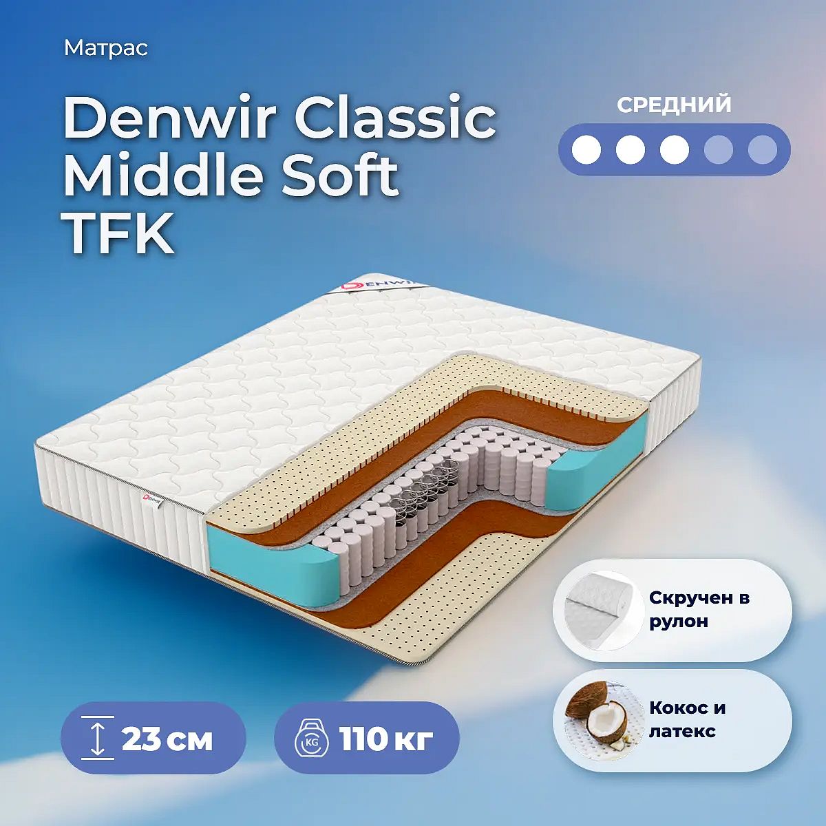 Матрас «Denwir Classic Middle Soft TFK» — средней жесткости, которая подходит большинству людей среднего телосложения. Это — универсальный вариант и детям, и взрослым, и пожилым людям.