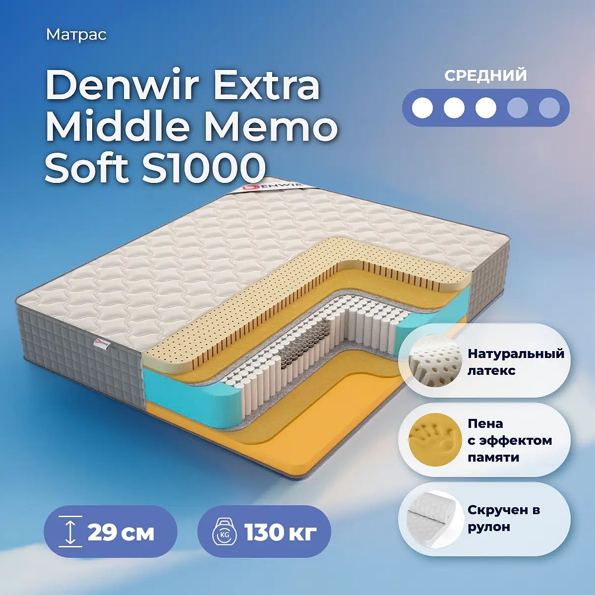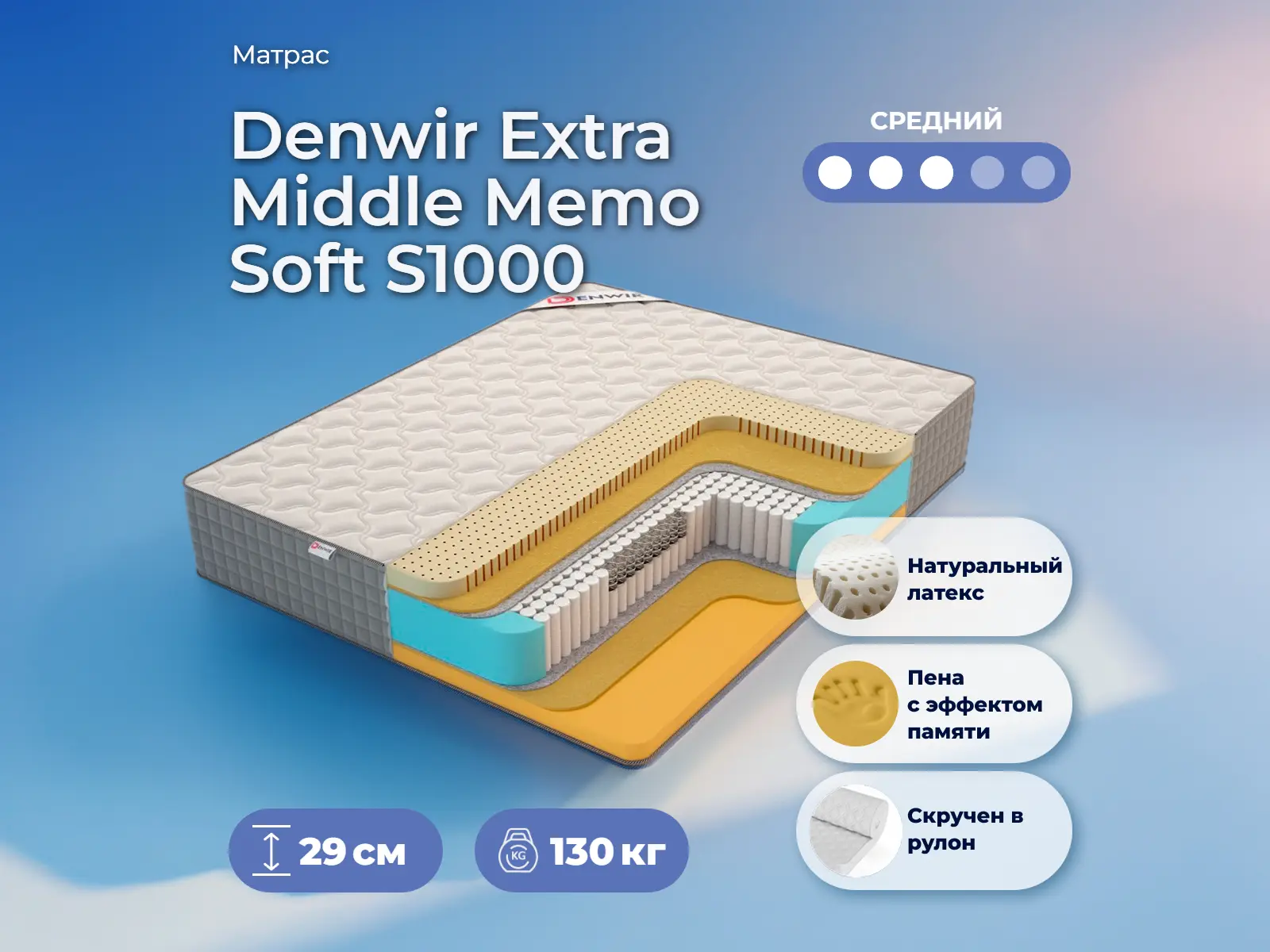 Матрас «Denwir Extra Middle Memo Soft S1000» — средней жесткости, которая подходит большинству людей среднего телосложения. Это — оптимальный вариант и детям, и взрослым, и пожилым людям.