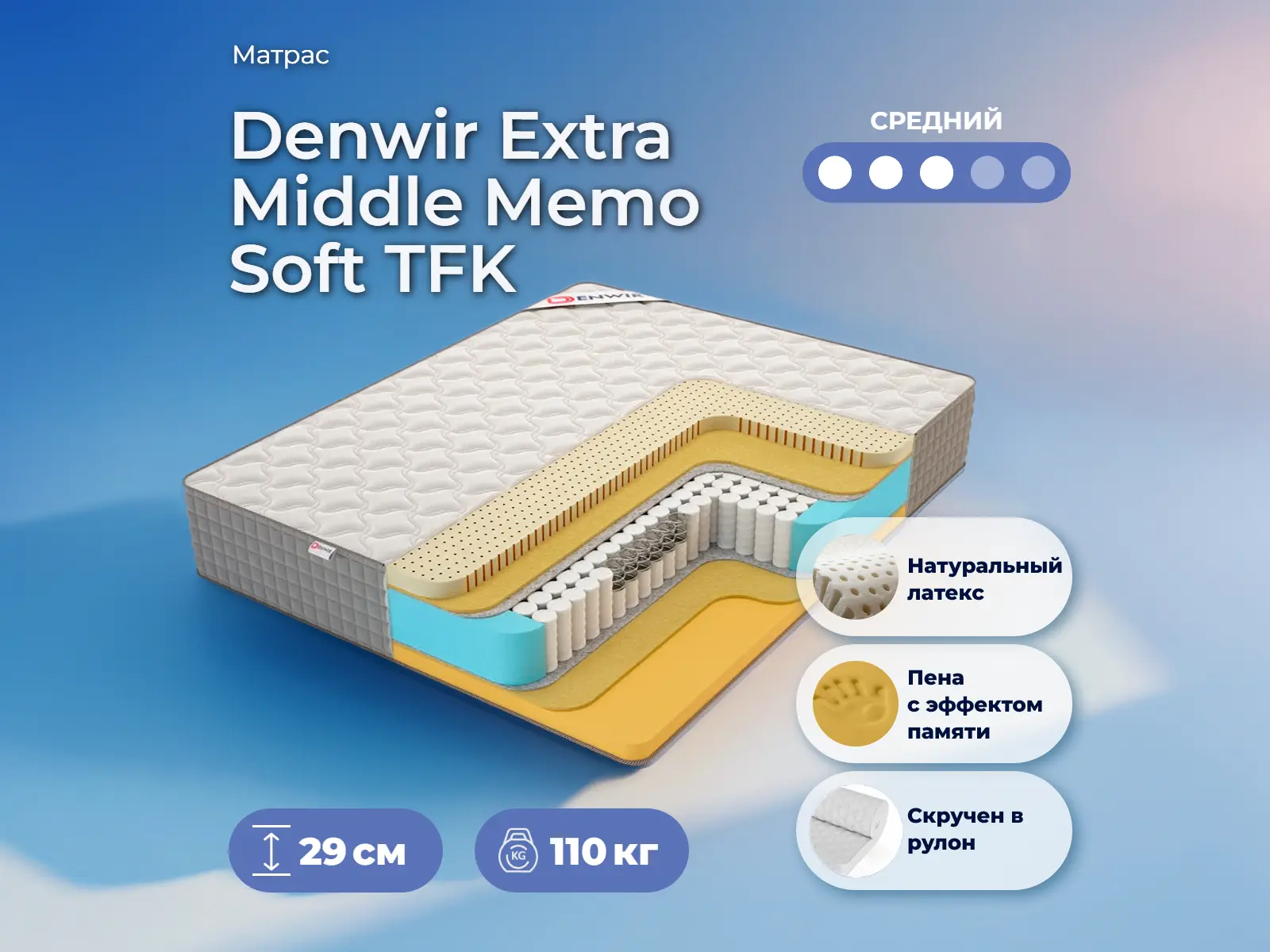 Матрас «Denwir Extra Middle Memo Soft TFK» — средней жесткости, которая комфортна большинству людей среднего телосложения. Это — оптимальный вариант и детям, и взрослым, и пожилым людям.