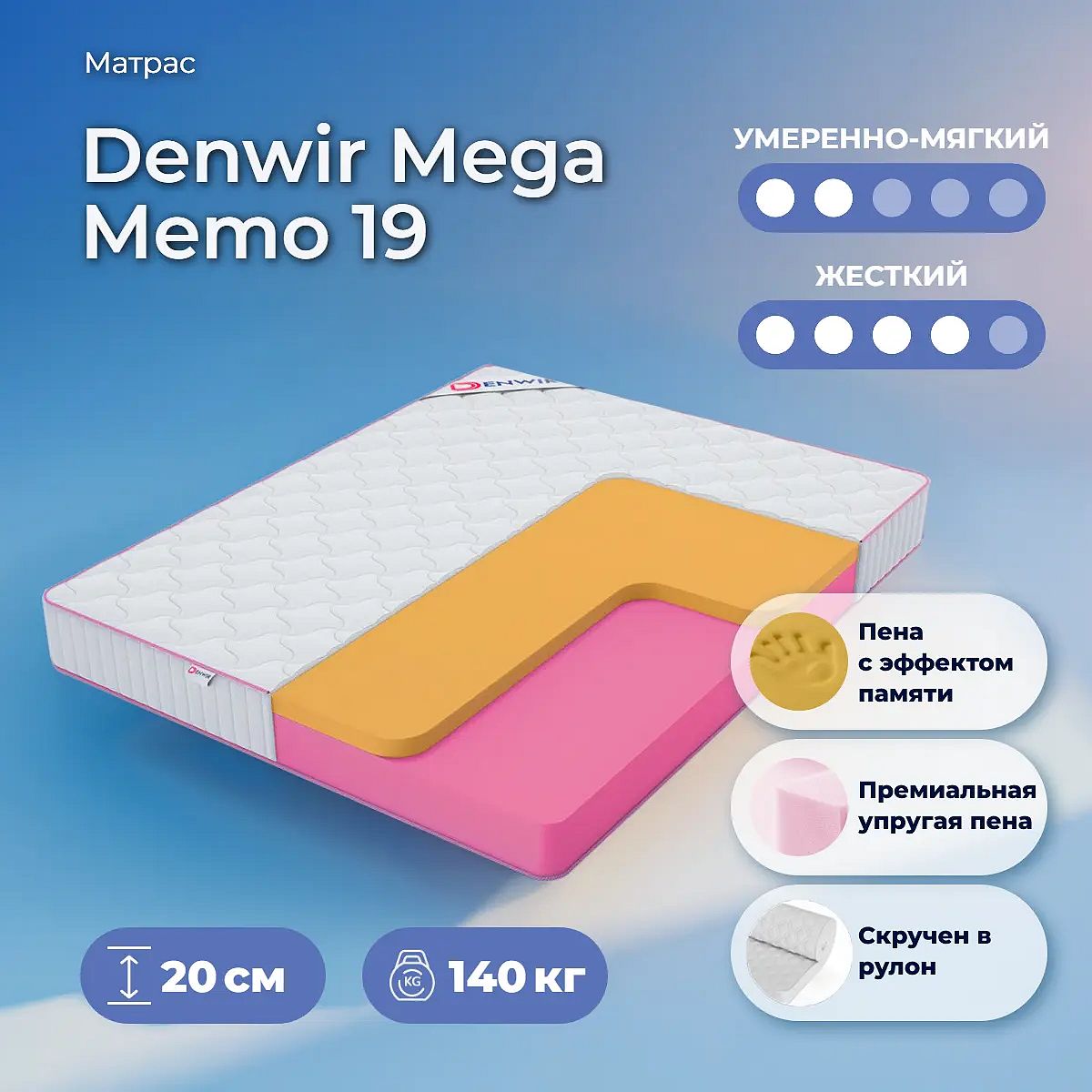 Максимальная нагрузка на спальное место: до 140 кг. Высота: 20 см. Матрас поставляется в скрученном виде. Пена Memory Foam с эффектом памятиПену Memory используют в матрасах как высокоэластичный и упругий наполнитель, который способен производить анатомический эффект. Memory запоминает форму тела человека, что исключает дополнительную нагрузку на сосуды отдыхающего. Поверхность матраса после снятия нагрузки очень быстро принимает первоначальную форму.Пена Elite Foam (EL4050)Пена имеет повышенную плотность, что создает достаточный уровень упругости для эффекта поддержки. Наполнитель отличается экологичностью и гигиеничностью. Высокая плотность пены позволяет выдерживать матрасу экстремальные нагрузки без ущерба сроку службы.