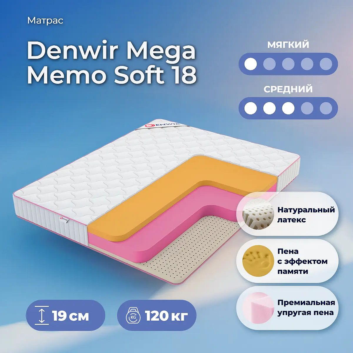 Максимальная нагрузка на спальное место: до 120 кг. Высота: 19 см. Матрас поставляется в скрученном виде. Пена Memory Foam с эффектом памятиПену Memory используют в матрасах как высокоэластичный и упругий наполнитель, который способен производить анатомический эффект. Memory запоминает форму тела человека, что исключает дополнительную нагрузку на сосуды отдыхающего. Поверхность матраса после снятия нагрузки очень быстро принимает первоначальную форму.Пена Elite Foam (EL4050)Пена имеет повышенную плотность, что создает достаточный уровень упругости для эффекта поддержки. Наполнитель отличается экологичностью и гигиеничностью. Высокая плотность пены позволяет выдерживать матрасу экстремальные нагрузки без ущерба сроку службы.Натуральный латексВысокий коэффициент растяжения и превосходная упругость натурального латекса делает его незаменимым при изготовлении матрасов. Благодаря перфорированной структуре спальное место хорошо дышит, не пропускает влагу. Латекс натурального происхождения обладает антисептическим эффектом. Натуральный латекс производят из стабилизированного сока гевеи. Для матрасов применяют перфорированный латекс плотностью 65 кг/м3. Характеризуется влагонепроницаемостью, упругостью, антибактериальными свойствами, долговечностью.