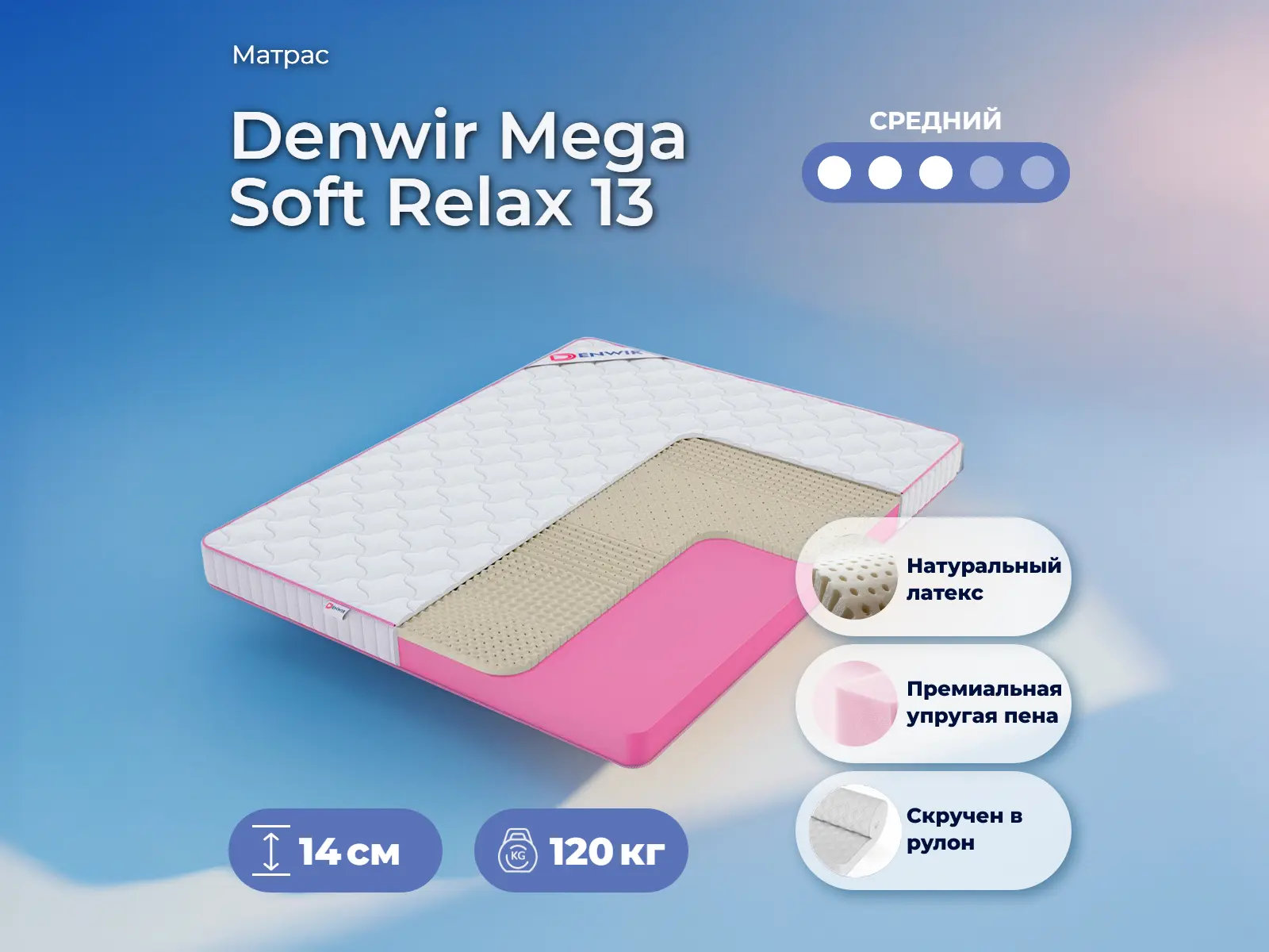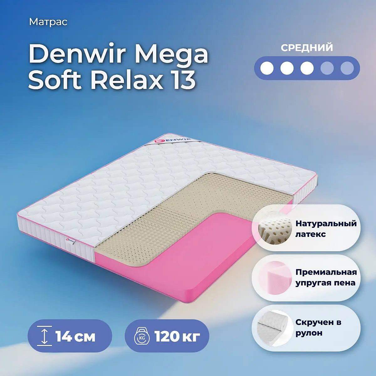 Матрас «Denwir Mega Soft Relax 13» — средней жесткости, которая подходит большинству людей среднего телосложения. Это — универсальный выбор и детям, и взрослым, и пожилым людям.