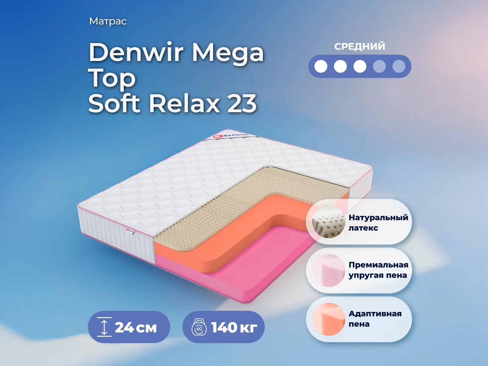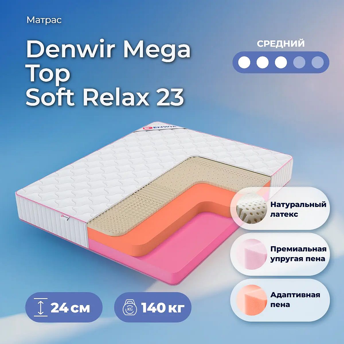 Матрас «Denwir Mega Top Soft Relax 23» — средней жесткости, которая подходит большинству людей среднего телосложения. Это — оптимальный выбор и детям, и взрослым, и пожилым людям.