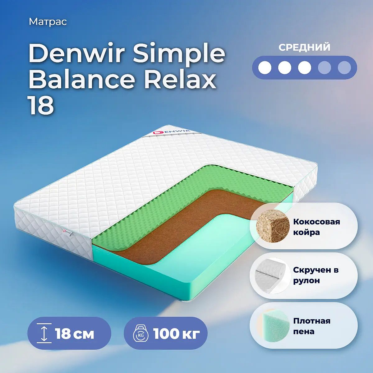 Матрас «Denwir Simple Balance Relax 18» — средней жесткости, которая подходит большинству людей среднего телосложения. Это — оптимальный выбор и детям, и взрослым, и пожилым людям.
