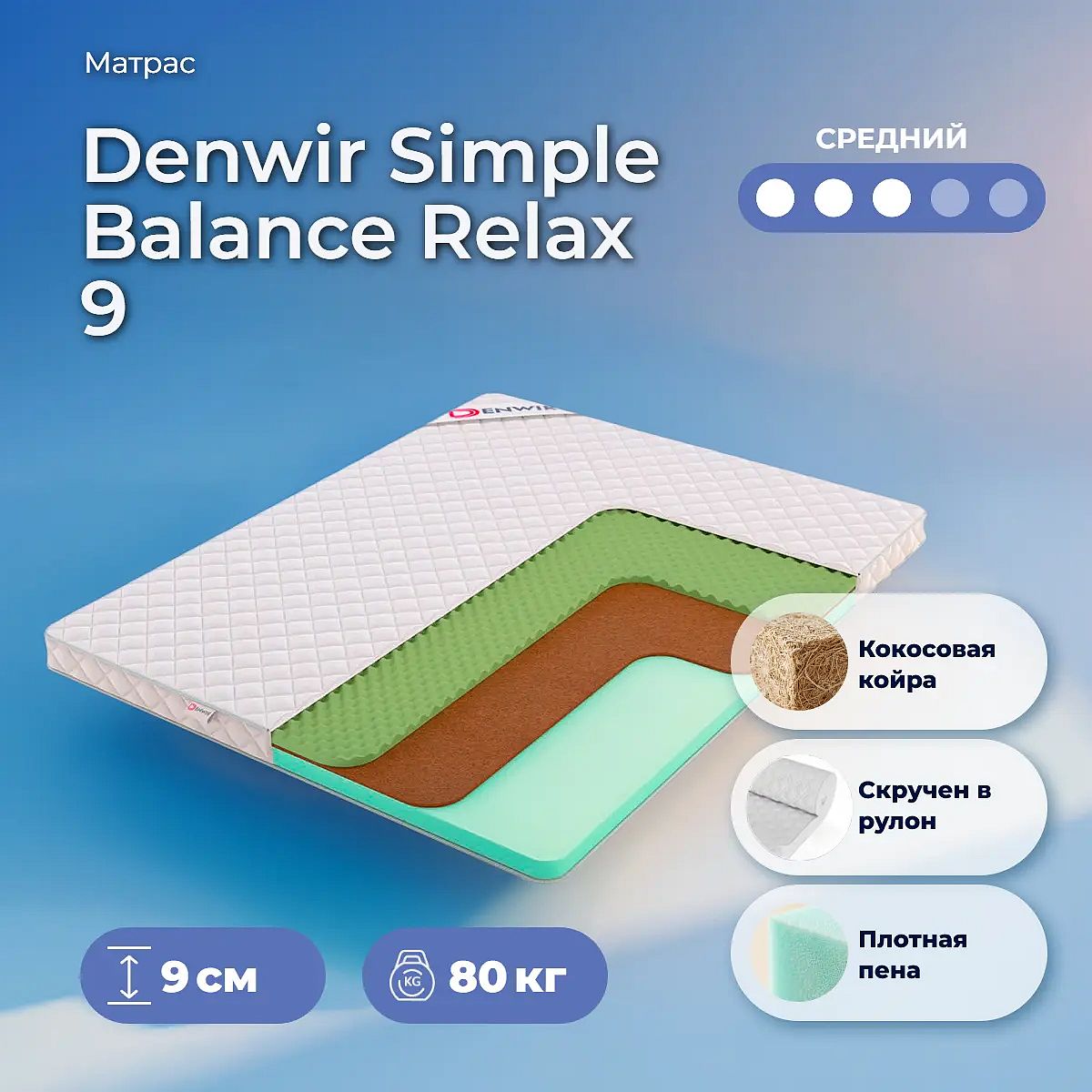 Матрас «Denwir Simple Balance Relax 9» — средней жесткости, которая комфортна большинству людей среднего телосложения. Это — универсальный вариант и детям, и взрослым, и пожилым людям.