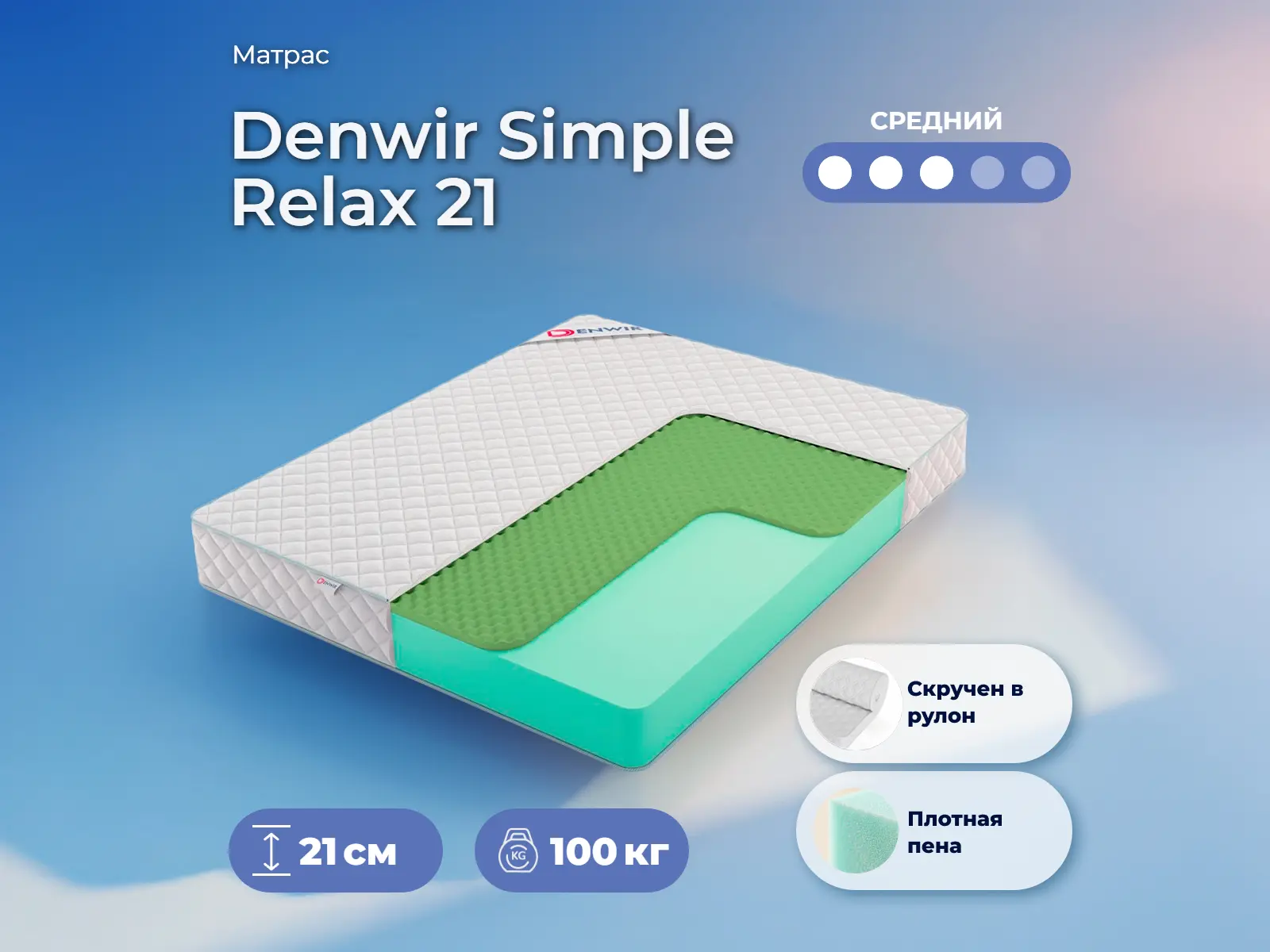 Матрас «Denwir Simple Relax 21» — средней жесткости, которая комфортна большинству людей среднего телосложения. Это — универсальный вариант и детям, и взрослым, и пожилым людям.