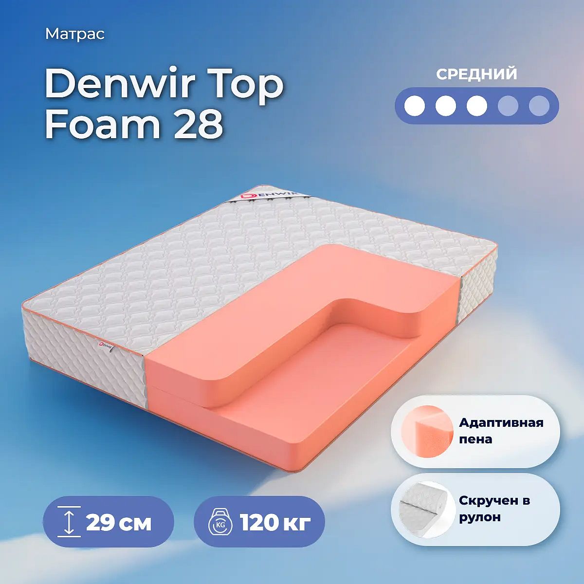 Матрас «Denwir Top Foam 28» — средней жесткости, которая подходит большинству людей среднего телосложения. Это — оптимальный вариант и детям, и взрослым, и пожилым людям.