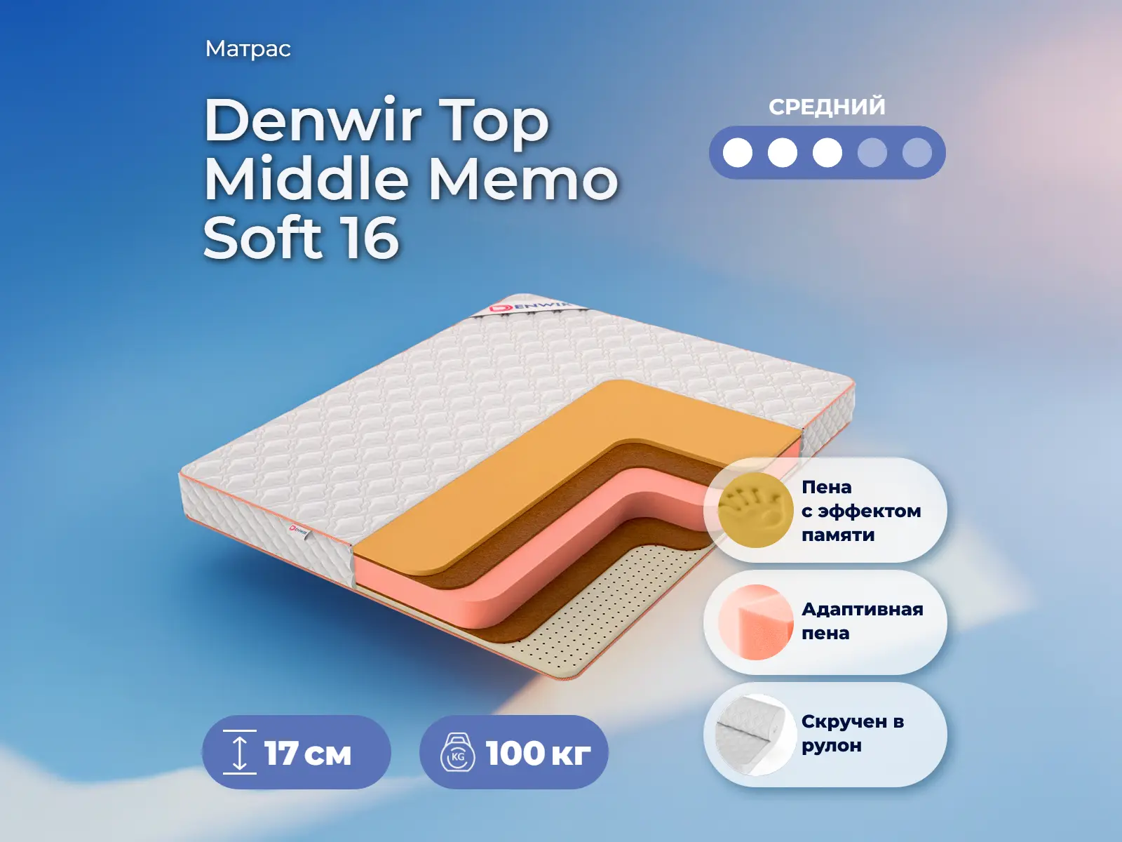 Матрас «Denwir Top Middle Memo Soft 16» — средней жесткости, которая подходит большинству людей среднего телосложения. Это — оптимальный выбор и детям, и взрослым, и пожилым людям.