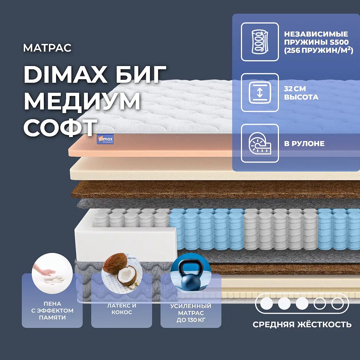 Высота, см: 32. Максимальная нагрузка, кг: 130. Матрас скручен в рулон! Матрас Димакс Биг Медиум Софт — это инновационная модель со специальным эффектом памяти формы. Она разработанная для тех, кто ищет правильный баланс между правильной поддержкой и обволакивающим комфортом. Преимущества матраса: • Адаптивная жёсткость: С одной стороны матрас имеет жёсткость выше средней, с другой — среднюю, что позволяет подобрать оптимальный комфорт для каждого спящего. • Натуральный латекс: Природный материал с высокой эластичностью, обеспечивающий мягкость и анатомическую поддержку. Это один из самых комфортных наполнителей. • Искусственный латекс: Упругая пена добавляет устойчивость к нагрузкам, быстро возвращает форму и является естественным продолжателем работы слоя натурального латекса. • Кокосовая койра: Натуральный жёсткий наполнитель, поддерживает позвоночник в анатомически правильном положении и предотвращает провалы. • Memory Foam: Высокотехнологичная пена с эффектом памяти, которая запоминает форму тела и обеспечивает индивидуальную подстройку спальной поверхности под анатомию. • Пружинный блок 5 Zone: 18-сантиметровый блок с высокой плотностью пружин, равномерно распределяет вес и обеспечивает опору для всего тела. Зоны с разной жёсткостью гарантирую более качественную поддержку разных частей тела. • Чехол 4D Original: Прочный трикотаж со специальной вертикальной структурой волокон обеспечивает воздухопроницаемость и сохраняет форму даже после многократного использования. • Нагрузочная способность: Подходит для людей весом до 130 кг, обеспечивая устойчивость и комфорт. Почему выбирают Димакс Биг Медиум Софт? Матрас идеально оптимально комбинирует натуральные и технологичные материалы в одном изделии. Благодаря слоистой конструкции с латексом, койрой и пружинами 5 Zone, он обеспечивает как расслабляющий комфорт, так и ортопедическую поддержку.