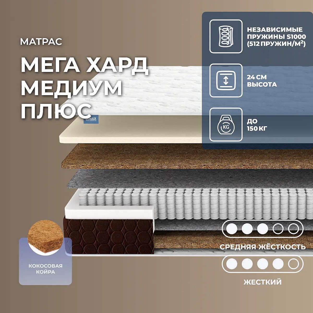 Матрас Dimax Мега Хард Медиум Плюс — это качественный пружинный матрас с разной жесткостью сторон, который подойдёт для ежедневного комфортного сна. Одна сторона матраса средней жесткости, вторая — более жесткая, что позволяет выбрать наиболее удобный уровень поддержки в зависимости от ваших потребностей и привычек. В основе — блок независимых пружин S1000 с плотностью 512 пружин на м2, равномерно распределяющий нагрузку и обеспечивающий анатомическую поддержку тела. Слой искусственного латекса толщиной 3 см придаёт матрасу упругость и повышает комфорт, а плиты кокосовой койры (2 и 3 см) делают поверхность более устойчивой и долговечной. Термовойлок используется для защиты наполнителей и увеличения срока службы изделия. Чехол Ultra-soft выполнен из приятного на ощупь трикотажа с мягкой стёжкой из холлкона и пены. Характеристики