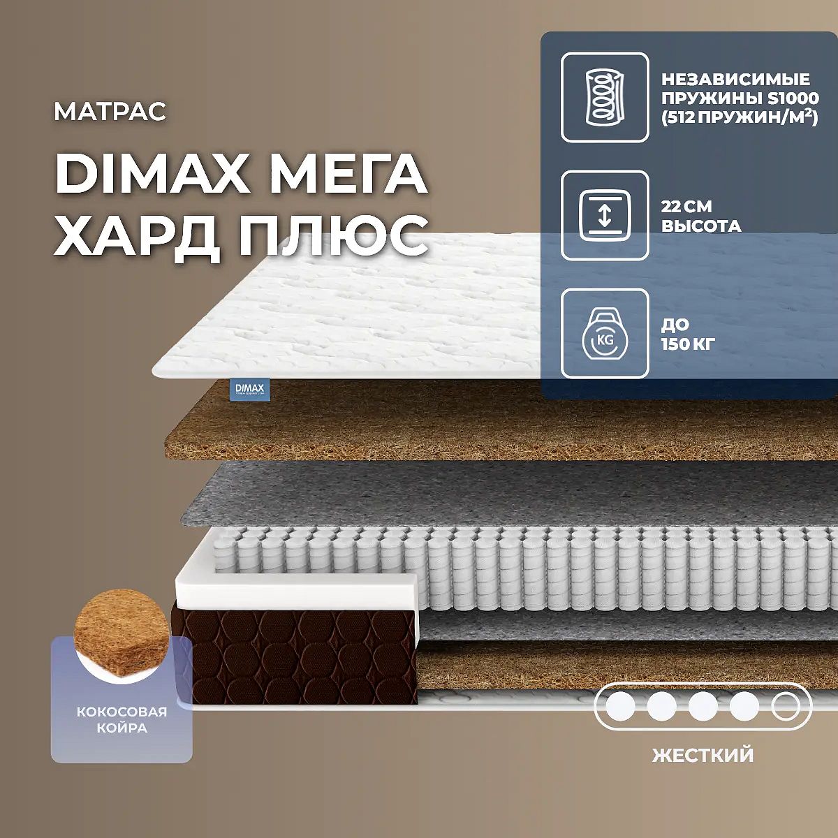 Матрас Dimax Мега Хард Плюс — это жёсткий пружинный матрас для тех, кто ценит базовый комфорт и надёжную поддержку во время сна. Благодаря симметричной конструкции и одинаковой жёсткости сторон, этот матрас обеспечивает стабильное положение тела и способствует полноценному отдыху. Высота 22 см делает его удобным для большинства кроватей. В основе матраса — современный блок независимых пружин S1000 с плотностью 512 пружин на м2. Такое количество пружин позволяет более точно подстраиваться под контуры тела и равномерно распределять нагрузку, что особенно важно при весе до 150 кг на каждое спальное место. С обеих сторон предусмотрены слои кокосовой койры толщиной 3 см, которые придают матрасу необходимую жёсткость, способствуют хорошей вентиляции и устойчивости к деформации. Прослойки термовойлока дополнительно увеличивают срок службы изделия и защищают наполнитель от износа. Чехол Ultra-soft выполнен из мягкого трикотажа с декоративной стёжкой на слоях холлкона и пены, что создаёт приятные тактильные ощущения и аккуратный внешний вид. Чехол несъёмный, поэтому для поддержания чистоты рекомендуется использовать защитный наматрасник (не входит в комплект). Характеристики