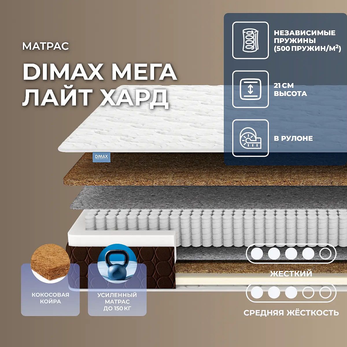 Уровень жесткости: высокий/выше среднего. Две стороны моделиМодель усилена слоями кокосовой койры и имеет двустороннее наполнение. По обеим сторонам проложены слои кокоса, одна сторона имеет слой пенополиуретана.Наполнение моделиОдна сторона жесткая и выполнена на основе кокосовой койры. Кокос обеспечивает надежную поддержку позвоночника, позволяет телу принимать естественное положение во время сна, кокос хорошо вентилируется. Другая сторона представлена сочетанием кокоса и пенополиуретана. ППУ делает поверхность более упругой, хорошо проводит воздух и быстро сохнет. Материал гипоаллергенный и очень прочный, способен выдерживать большие нагрузки.Действие пружин S1000Основу модели составляет пружинный блок независимой конструкции. В блоке S1000 по 500 микропружин занимают 1 кв. метр поверхности. Каждая пружина отделена от другой и помещена в специальный индивидуальный чехол из прочного материала. Поэтому пружины действуют точечно и только тогда, когда на них направлена нагрузка.Чехол из трикотажаЧехол для матраса выполнен из мягкого трикотажа с объемной стежкой по сразу двум наполнителям ППУ и холлкону, которые обеспечивают упругость, мягкость и пластичность поверхностей для комфортного сна. Боковая часть, выполненная из прочной мебельной ткани темно-коричневого оттенка и усиливает износоустойчивость матраса. Фирменная обивка формирует уютное и здоровое место для отдыха и восстановления сил.Общая толщина матраса составляет 21 см. Защита матрасаДля защиты поверхности от пятен от пролитых жидкостей, грязи и пыли рекомендуем купить дополнительно защитный чехол или водонепроницаемый наматрасник.Другие моделиПосмотрите также другие модели этой серии: Dimax Мега Медиум Лайт, Dimax Мега Ультимэйт.Скрутка в рулонПо умолчанию матрас поставляется в развернутом виде. По вашему желанию матрас может быть доставлен в скрученном виде.При доставке транспортной компанией матрас всегда скручивается в рулон. Хранение матрасов в скрутке должно осуществляться: