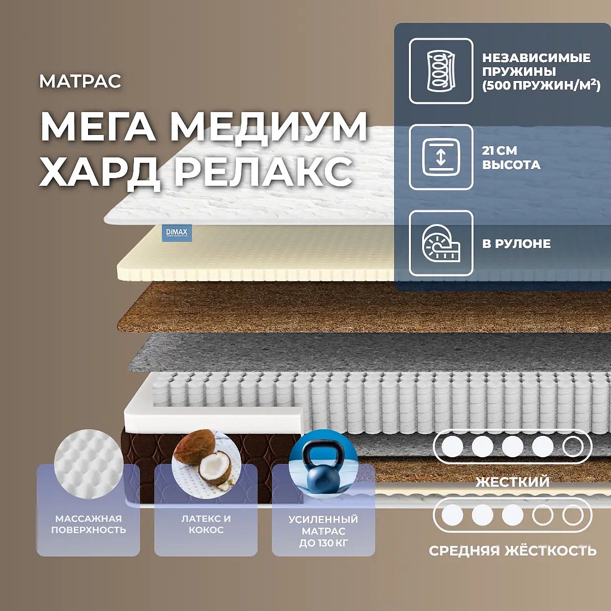 Максимальная нагрузка, кг: 130. Высота, см: 21. Комфортный двусторонний матрас Мега Лайт Хард Релакс обладает разной жёсткостью спальных поверхностей: высокой и выше среднего значения. Модель получила в свою основу усиленный независимый блок пружин, поэтому легко выдерживает большие весовые нагрузки до 130 кг на спальное место. НаполнителиОбе спальные поверхности изделия проложены массажной пеной и койрой кокоса. Только в одном случае толщина койры составляет 1 см, а в другом – 2 см. Сделано это для того, чтобы придать матрасу различные уровни жёсткости.Пена Массаж Фоам обладает специальной волнообразной резкой, благодаря которой оказывает на тело человека приятный массажный эффект. Наполнитель способствует более активной циркуляции лимфы и крови внутри тканей. В результате отдыхающий быстрее и глубже расслабляется, а качество сна значительно возрастает. Пружинный блокВ центре матраса расположился независимый блок S1000. Он включает около тысячи элементов на спальное место. Система отвечает за правильную ортопедическую поддержку человека. С помощью многочисленных пружин механизм адаптируется под нагрузку, а также специфику анатомии, создавая максимально комфортную и при этом правильную опору для спины.ЧехолЧехол матраса также отвечает за комфортный и здоровый сон. Его спальная сторона выполнена из нежного трикотажа с объемной стежкой из ППУ и холлкону, обеспечивая максимальное удобство и адаптивность. Бурлет выполнен из прочной мебельной ткани коричневого цвета, простеганной на ППУ. Чехол не только защитит матрас, но и станет прекрасным дополнением к вашему интерьеру.Скрутка в рулонПо умолчанию матрас поставляется в развернутом виде. По вашему желанию матрас может быть доставлен в скрученном виде.При доставке транспортной компанией матрас всегда скручивается в рулон. Хранение матрасов в скрутке должно осуществляться: