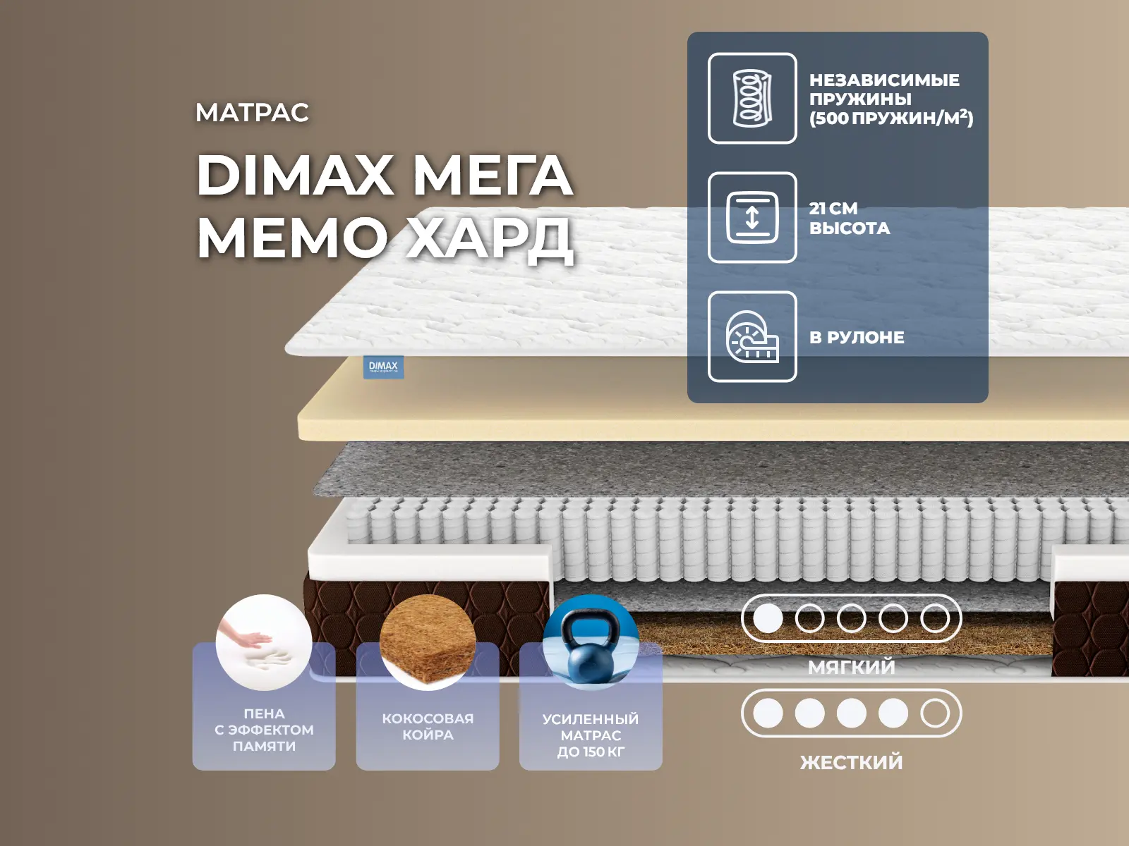 Уровень жесткости: низкий/высокий. Две разножесткие стороны на пружинахМодель имеет двустороннее наполнение и базируется на пружинном блоке S1000. Ее можно переворачивать и, таким образом, можно изменять жесткость спального места.Упругая поддержка для телаС одной стороны проложен современный наполнитель с мегаупругой структурой – мемориформ. Он максимально точно подстраивается и повторяет все контуры тела и под воздействием температуры может запоминать их. Когда человек встает с такой поверхности, то может увидеть, что на ней образовался отпечаток его тела. Мемориформ обеспечивает максимальное расслабление, он хорошо вентилируется и имеет долгий эксплуатационный срок.Полезное действие кокосаС другой стороны проложен наполнитель кокосовая койра. Это природный материал, который получают из ореха кокосовой пальмы. Волокна его жесткие и сухие, для скрепления их используется млечный сок дерева Гевея. Получается достаточно упругий и прочный наполнитель с хорошими воздухопроницаемыми свойствами. Он отлично вентилируется и создает надежную поддержку для позвоночника.Действие пружин S1000Независимый пружинный блок S1000 – это надежная основа из 1000 микропружин, по 500 на 1 кв. метр. Пружины изолированы друг от друга и помещены в чехлы. Нагрузка в такой конструкции распределяется равномерно, пружины воздействуют точечно и создается благоприятный микроклимат на поверхности. По периметру такой блок усилен слоями пенополиуретана.Чехол из трикотажаЧехол выполнен из мягкого трикотажа и получил дополнительный объем за счёт высокой стежки по ППУ и холлкону. В результате использования сразу двух наполнителей создается красивый рельефный узор на спальной поверхности.Боковая часть изготовлена из тёмно-коричневой мебельной ткани с простёжкой по ППУ. Контрастный цвет материала добавляет матрасу элегантности и стильности. Обивка обеспечивает высокую износостойкость и долговечность, что позволяет сохранить привлекательный внешний вид матраса на долгие годы. Рекомендованная нагрузка – до 150 кг на спальное место, высота спальной принадлежности – 21 см. Защита матрасаДля защиты поверхности от пятен от пролитых жидкостей, грязи и пыли рекомендуем купить дополнительно защитный чехол или водонепроницаемый наматрасник.Другие моделиПосмотрите также другие модели этой серии: Dimax Мега Медиум Мемо, Dimax Мега Мемо Софт.Скрутка в рулонПо умолчанию матрас поставляется в развернутом виде. По вашему желанию матрас может быть доставлен в скрученном виде.При доставке транспортной компанией матрас всегда скручивается в рулон. Хранение матрасов в скрутке должно осуществляться: