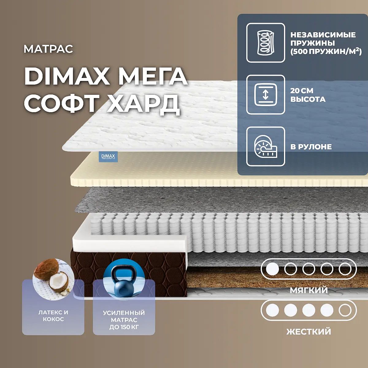 Уровень жесткости: низкий/высокий. Жесткая поддержка кокосаЕсли вы хотите поверхность пожестче, тогда переворачивайте на сторону с кокосовой койрой. Это природный жесткий наполнитель, обладающий повышенным уровнем гигиеничности и прочности. Он хорошо вентилируется и создает надежную основу для позвоночника. Кокос – это гипоаллергенный наполнитель без запаха.Материал для расслабленияЕсли же вам по душе мягкая поверхность, то переверните на сторону с латексом. Это тоже натуральный материал, он очень мягкий и эластичный. Благодаря повышенной гибкости и упругости латекс подстраивается под все изгибы тела и сообщат ему максимальный комфорт и расслабление. Латекс не вызывает аллергических реакций и не имеет запаха.Действие пружин S1000Вся конструкция держится на блоке независимых пружин S1000. Это мощный пружинный блок высокого качества, который обеспечивает максимальный уровень поддержки и комфорт на поверхности. Каждая пружина в таком блоке находится в отдельном чехле и воспринимает нагрузку точечно и автономно. В результате нагрузка распределяется равномерно д тело по всей поверхности. По периметру такой блок усилен слоем пенополиуретана.Чехол из трикотажаКонструкция чехла матраса продумана до мелочей. Спальная сторона изготовлена из нежного трикотажа, который приятен к телу и создает мягкую, комфортную поверхность для сна. Объемная стежка из ППУ и холлкона формирует красивый рельеф и обеспечивает дополнительную упругость и мягкость.Боковая сторона чехла выполнена из мебельной ткани цвета шоколада и простегана по ППУ. Оттенок бурлета придаёт матрасу стильный и элегантный облик. В сочетании с высококачественным наполнением и пружинным блоком, чехол создает комфортную и здоровую поверхность для сна. Толщина матраса – 20 см, рекомендованная нагрузка – до 150 кг на спальное место. Защита матрасаДля защиты поверхности от пятен от пролитых жидкостей, грязи и пыли рекомендуем купить дополнительно защитный чехол или водонепроницаемый наматрасник.Другие моделиПосмотрите также другие модели этой серии: Dimax Мега Лайт Базис, Dimax Мега Лайт Хард.Скрутка в рулонПо умолчанию матрас поставляется в развернутом виде. По вашему желанию матрас может быть доставлен в скрученном виде.При доставке транспортной компанией матрас всегда скручивается в рулон. Хранение матрасов в скрутке должно осуществляться: