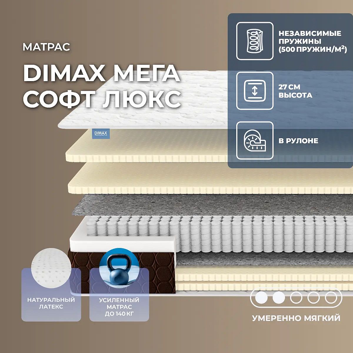 Уровень жесткости: низкий. Наполнение моделиМодель Мега Софт Люкс изготавливается на основе слоев натурального материала – латекса. Его получают из млечного сока бразильского дерева Гевея и вспенивают особым образом. Материал получается очень мягким и эластичным. Латекс хорошо расслабляет, снимает усталость и напряжение, а также восстанавливает кровоток. Это гипоаллергенный материал высокого качества.Действие пружин S1000В основе модели находится пружинный блок S1000. В нем около 500 микропружин на 1 кв. метре, они находится в отдельном чехле из прочного и эластичного материал – спанбонда - и точечно воздействует на тело спящего, доставляет комфорт и расслабление спящему. Такой пружинный блок способен выдерживать большие нагрузки. По периметру блок усилен слоем пенополиуретана.Чехол из трикотажаЧехол выполнен из мягкого трикотажа и имеет тёмно-коричневый бурлет, сшитый из мебельной ткани с прострочкой по ППУ. Спальные стороны отличает очень объемная стежка по ППУ и холлофайберу, что придаёт поверхности эластичность, пластичность и комфортный ощущения. Бурлет отвечает за усиление прочности, а его коричневый оттенок добавляет стильности и изысканности. Этот чехол позволит вам расслабиться и уютно отдохнуть в постели после долгого дня. Высота матраса составляет 27 см.Защита матрасаДля защиты поверхности от пятен от пролитых жидкостей, грязи и пыли рекомендуем купить дополнительно защитный чехол или водонепроницаемый наматрасник.Другие моделиПосмотрите также другие модели этой серии: Dimax Мега Мемо Софт, Dimax Мега Мемо.Скрутка в рулонПо умолчанию матрас поставляется в развернутом виде. По вашему желанию матрас может быть доставлен в скрученном виде.При доставке транспортной компанией матрас всегда скручивается в рулон. Хранение матрасов в скрутке должно осуществляться: