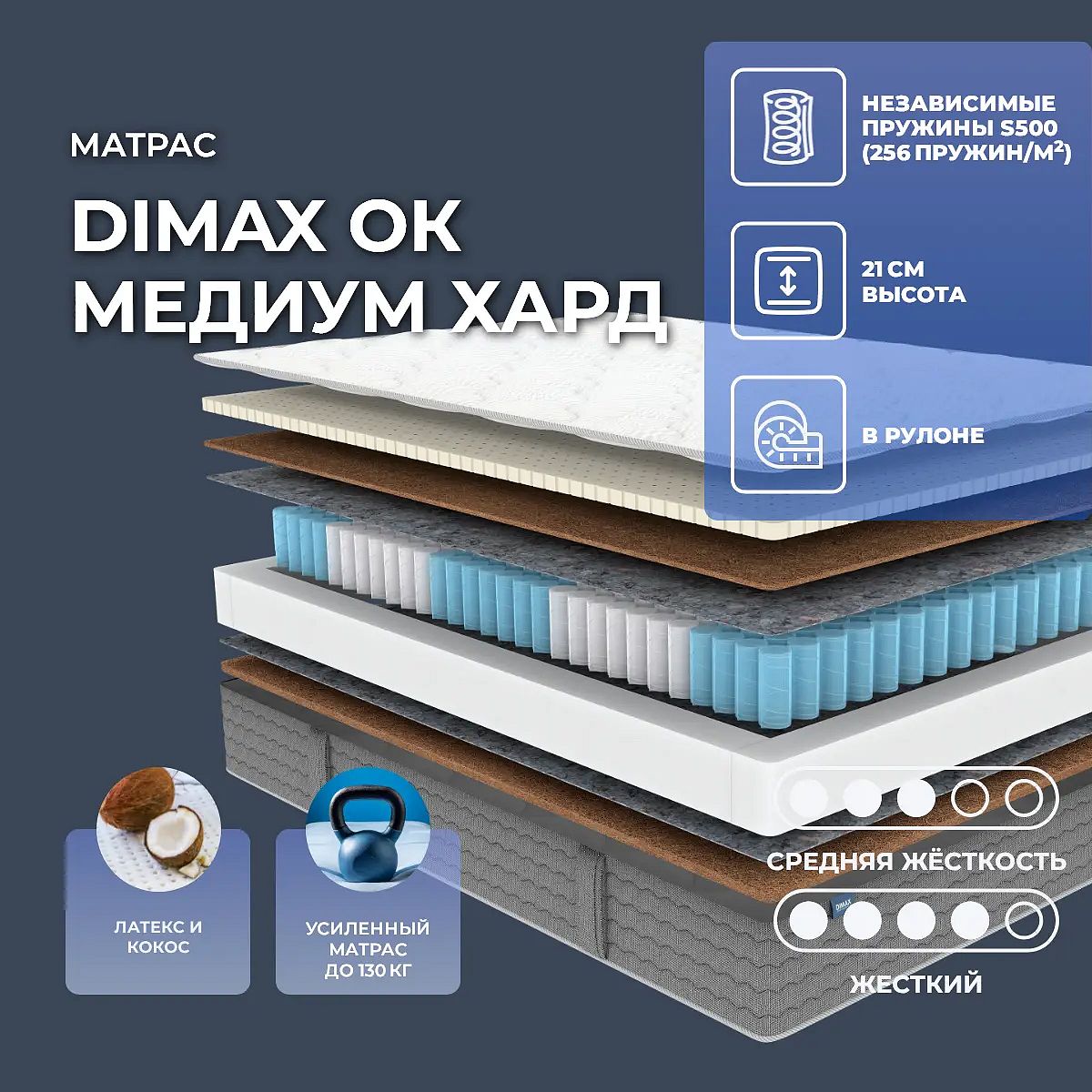 Две стороны жесткостиМодель имеет две асимметричные стороны: одну средне–жесткую, другую – жесткую. Вы можете выбрать любую, а также наполнитель по душе.Поддержка жесткого кокосаЖесткая сторона выполнена на основе гипоаллергенной кокосовой койры. Это натуральный материал, получаемый из волокон ореха кокосовой пальмы. Он обладает повышенным уровнем жесткости, а также очень прочный и гигиеничный. Кокос обеспечивает первоклассную поддержку позвоночника и позволяет телу вытягиваться и расслабляться.Сочетание кокоса и латексаСредне–жесткая сторона представлена кокосовой койрой и натуральным латексом. Эти материалы хорошо дополняют друг друга и обеспечивают максимальный комфорт на поверхности. Кокос жесткий, а латекс мягкий. Латекс сглаживает кокос и делает поверхность более упругой и эластичной, способствует релаксации, снимает напряжение и стресс. Материал гипоаллергенный и нетоксичный.Особенности работы пружин 5 ZoneОсновой модели служит независимый блок, где установлено сразу 512 пружин на спальное место. Именно они отвечают за равномерное распределение нагрузки и точечную физиологически правильную поддержку позвоночника. Независимые пружины гарантируют матрасу отличную поддержку, а в купе со специальными материалами создают уникальное по комфорту спальное место.Пружинный блок 5 Zone состоит из пружин разной жёсткости. Это даёт более продуманную и сбалансированную поддержку всего тела. Механизм усиливает район бёдер и плеч, а мягкие спирали поддерживают конечности и голову, обеспечивая комфорт спящему. По обеим сторонам от блока проложены слои термоизолирующего войлока. Трикотажный несъемный чехол 4D OriginalВерх матраса состоит из дополнительного комфортного слоя. Прошивной четырехслойный чехол с лицевой стороны состоит из мягкого трикотажа, внутри расположен объемный синтепон в сочетании с пеной Balance, завершающий фиксирующий слой – прочный спанбонд. Бурлет из прочной мебельной ткани рогожки обеспечивает долгосрочную эксплуатацию. По длинным сторонам матраса расположены ручки, с ними удобно менять постельное белье, переворачивать матрас, а так же они придают эстетичный внешний вид.Защита матрасаДля защиты поверхности от пятен от пролитых жидкостей, грязи и пыли рекомендуем купить дополнительно защитный чехол или водонепроницаемый наматрасник.Другие моделиПосмотрите также другие модели серии OK: Dimax OK Струтто Хард, Dimax OK Медиум Софт.Скрутка в рулонПо умолчанию матрас поставляется в развернутом виде. По вашему желанию матрас может быть доставлен в скрученном виде.При доставке транспортной компанией матрас всегда скручивается в рулон. Хранение матрасов в скрутке должно осуществляться: