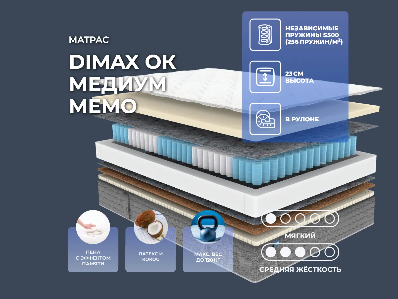 Уникальный материалМягкая сторона модели выполнена из материала с эффектом памяти формы – мемори. Материал полностью гипоаллергенный и гигиеничный, отлично вентилируется и не имеет запаха. На нем комфортно и удобно. Мемори максимально расслабляет тело, подстраивается под него, а также имеет способность запоминать все его контуры и повторять их.Сочетание кокоса и латексаСредне–жесткая сторона выполнена на основе сочетания кокосовой койры и натурального латекса. Оба материала гипоаллергенные и экологически чистые, не имеют запаха. Оба характеризуются хорошей воздухопроводимостью и гигиеничностью. Кокос разглаживает поверхность, делает ее максимально жесткой, а латекс создает упругость и эластичность, мягко расслабляет тело.Особенности работы пружин 5 ZoneОсновой модели служит независимый блок, где установлено сразу 512 пружин на спальное место. Именно они отвечают за равномерное распределение нагрузки и точечную физиологически правильную поддержку позвоночника. Независимые пружины гарантируют матрасу отличную поддержку, а в купе со специальными материалами создают уникальное по комфорту спальное место.Пружинный блок 5 Zone состоит из пружин разной жёсткости. Это даёт более продуманную и сбалансированную поддержку всего тела. Механизм усиливает район бёдер и плеч, а мягкие спирали поддерживают конечности и голову, обеспечивая комфорт спящему. По обеим сторонам от блока проложены слои термоизолирующего войлока. Трикотажный несъемный чехол 4D OriginalВерх матраса состоит из дополнительного комфортного слоя. Прошивной четырехслойный чехол с лицевой стороны состоит из мягкого трикотажа, внутри расположен объемный синтепон в сочетании с пеной Balance, завершающий фиксирующий слой – прочный спанбонд. Бурлет из прочной мебельной ткани рогожки обеспечивает долгосрочную эксплуатацию. По длинным сторонам матраса расположены ручки, с ними удобно менять постельное белье, переворачивать матрас, а так же они придают эстетичный внешний вид.Защита матрасаДля защиты поверхности от пятен от пролитых жидкостей, грязи и пыли рекомендуем купить дополнительно защитный чехол или водонепроницаемый наматрасник.Другие моделиПосмотрите также другие модели серии OK: Dimax OK Мемо Хард, Dimax OK Медиум Софт.Скрутка в рулонПо умолчанию матрас поставляется в развернутом виде. По вашему желанию матрас может быть доставлен в скрученном виде.При доставке транспортной компанией матрас всегда скручивается в рулон. Хранение матрасов в скрутке должно осуществляться:
