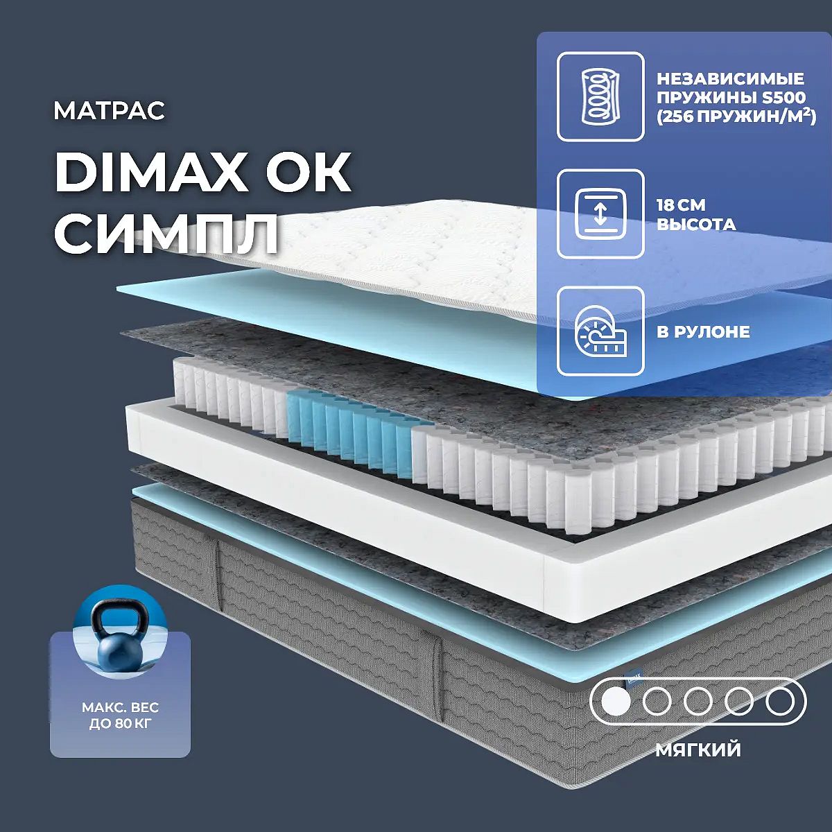 Мягкий матрас «Dimax ОК Симпл» отлично подойдет человеку с небольшим весом, предпочитающему высокий уровень комфорта.