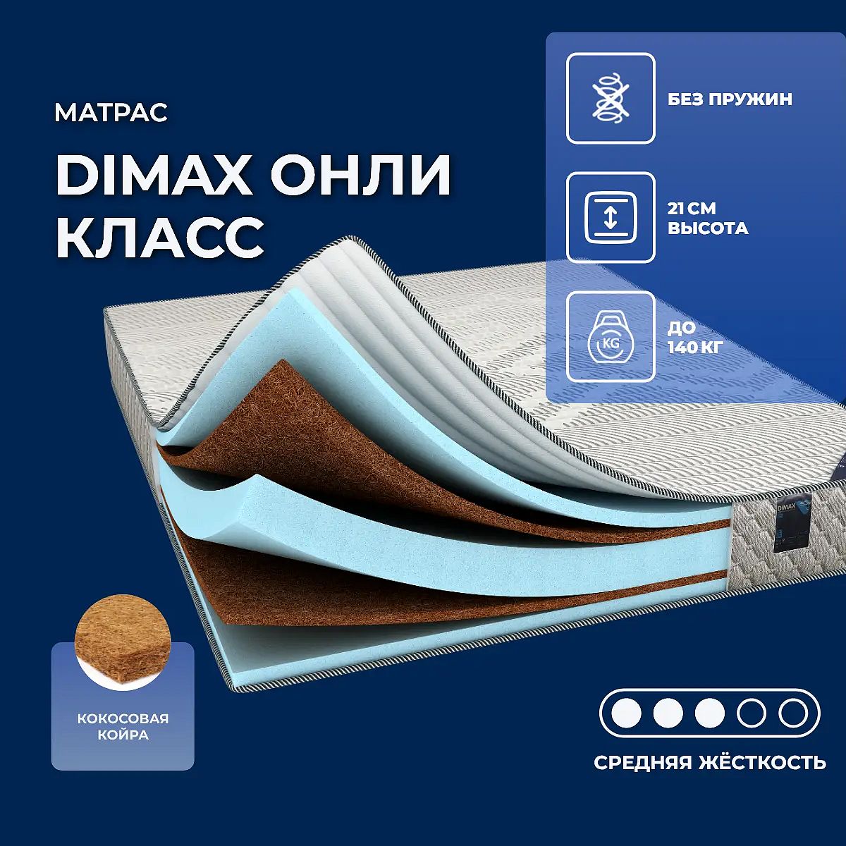 Матрас «Dimax Онли Класс» — средней жесткости, которая комфортна большинству людей среднего телосложения. Это — универсальный вариант и детям, и взрослым, и пожилым людям.