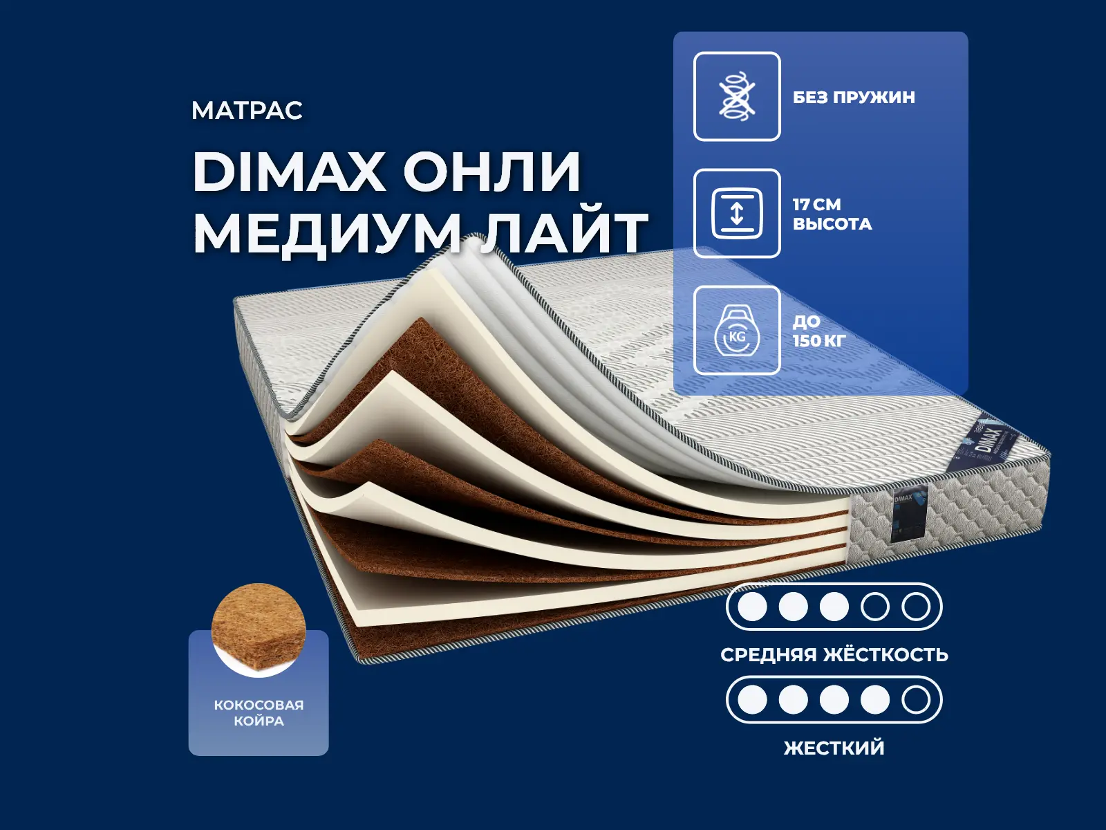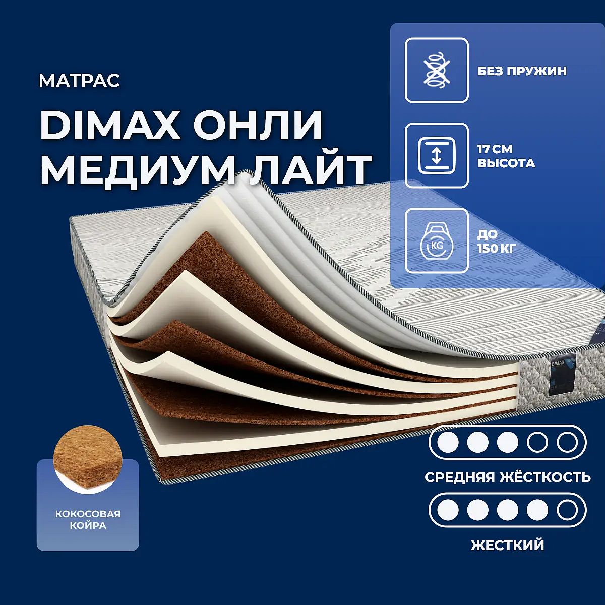 Уровень жесткости: выше среднего/высокий. Две стороны жесткостиМодель Онли Медиум Лайт имеет две спальные поверхности: одну на основе сочетания ППУ- кокос, другую - на сочетании кокос-ППУ. Соответственно, одна сторона менее жесткая, чем другая.Сочетание ППУ-кокосСторона ППУ-кокос имеет среднюю жесткость. Такая жесткость подойдет абсолютно всем, вне зависимости от возраста и веса спящего. ППУ разглаживает и смягчает кокосовую койру и создает оптимальный микроклимат на поверхности за счет налаженной системы вентиляции и способности быстро впитывать влагу.Сочетание кокос-ППУСторона кокос-ППУ более жесткая за счет кокосовой койры. Это материала повышенной жесткости, который отлично вентилируется и создает оптимальные условия для комфортного сна. Кокос обеспечивает надежную поддержку тела спящего, позволяет ему принимать естественное положение во время сна. Материал гипоаллергенный и очень прочный.Трикотажный чехолЧехол модели изготавливается из стеганого трикотажа.Защита матрасаДля защиты поверхности от пятен от пролитых жидкостей, грязи и пыли рекомендуем купить дополнительно защитный чехол или водонепроницаемый наматрасник.Другие моделиПосмотрите также другие модели серии OK: Dimax Онли Медиум Софт, Dimax Онли Медиум.