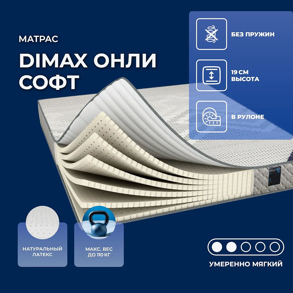 Уровень жесткости: ниже среднего. Мягкий материалОснову модели Онли Софт составляет 6 уложенных поочередно слоев натурального латекса. Это супермягкая модель для тех, кто обожает мягкие поверхности и комфортный сон.Наполнение моделиНатуральный латекс - это природный материал, который получают из вспененного сока бразильского дерева Гевея. Латекс характеризуется повышенной эластичностью и упругостью, способен принимать и повторять все контуры тела, максимально расслаблять его. Латекс - гипоаллергенный материал без запаха и вредных примесей, показан даже людям, страдающим аллергией.Трикотажный чехолЧехол модели изготавливается из трикотажа с комфортным слоем.Защита матрасаДля защиты поверхности от пятен от пролитых жидкостей, грязи и пыли рекомендуем купить дополнительно защитный чехол или водонепроницаемый наматрасник.Другие моделиПосмотрите также другие модели серии OK: Dimax Онли Базис, Dimax Онли Софт Люкс.Скрутка в рулонПо умолчанию матрас поставляется в развернутом виде. По вашему желанию матрас может быть доставлен в скрученном виде.При доставке транспортной компанией матрас всегда скручивается в рулон. Хранение матрасов в скрутке должно осуществляться: