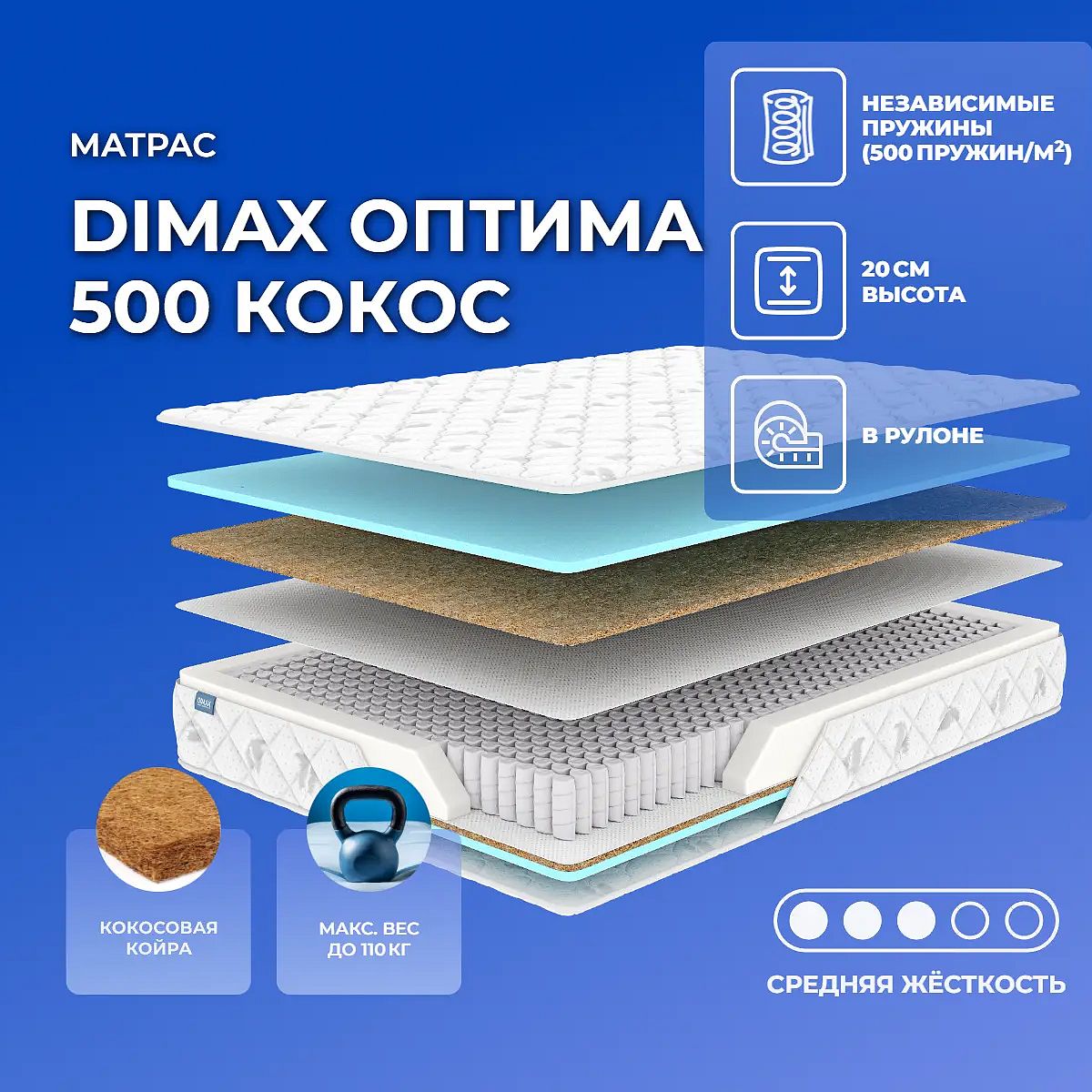Матрас «Dimax Оптима 500 Кокос» — средней жесткости, которая подходит большинству людей среднего телосложения. Это — универсальный вариант и детям, и взрослым, и пожилым людям.