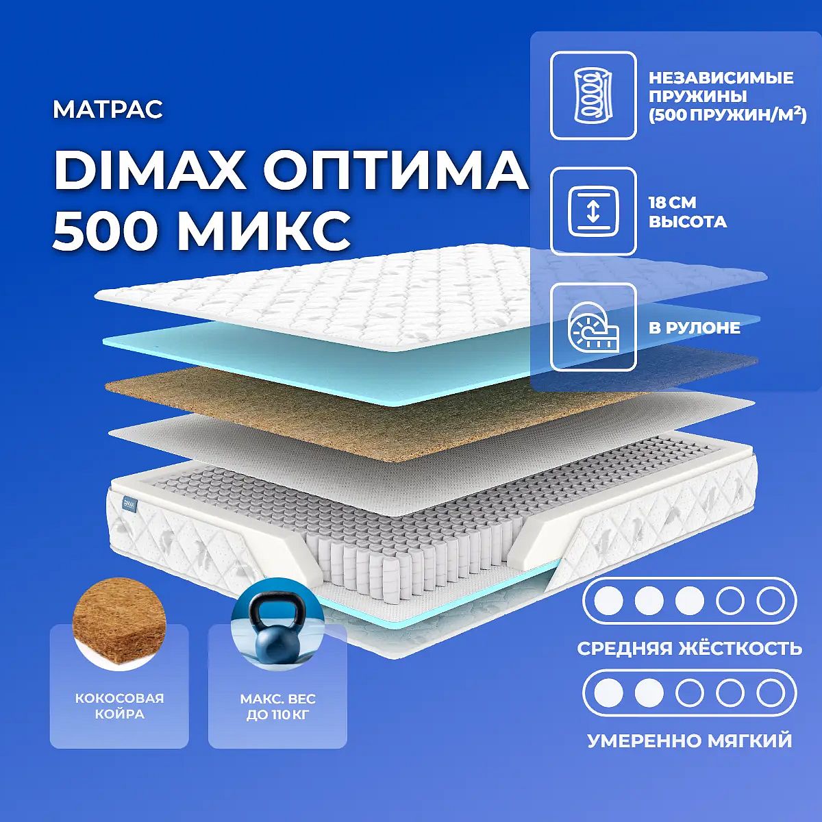 Матрас Dimax Оптима 500 Микс — это современный пружинный матрас с разной жёсткостью сторон для комфортного сна. Одна сторона средней жёсткости, другая — умеренно мягкая. Благодаря независимым пружинам S1000 (500 пружин на м2) достигается точечная поддержка тела и устойчивость к деформациям. Высота матраса — 18 см, максимальная нагрузка на спальное место — 110 кг. В составе матраса используются качественные материалы: слой ППУ придаёт мягкость и упругость, кокосовая койра обеспечивает дополнительную поддержку и вентиляцию, а спанбонд служит изоляционным слоем. Чехол выполнен из трикотажа, простёганного на синтепоне, что делает поверхность приятной на ощупь и аккуратной на вид. Чехол несъёмный. Характеристики